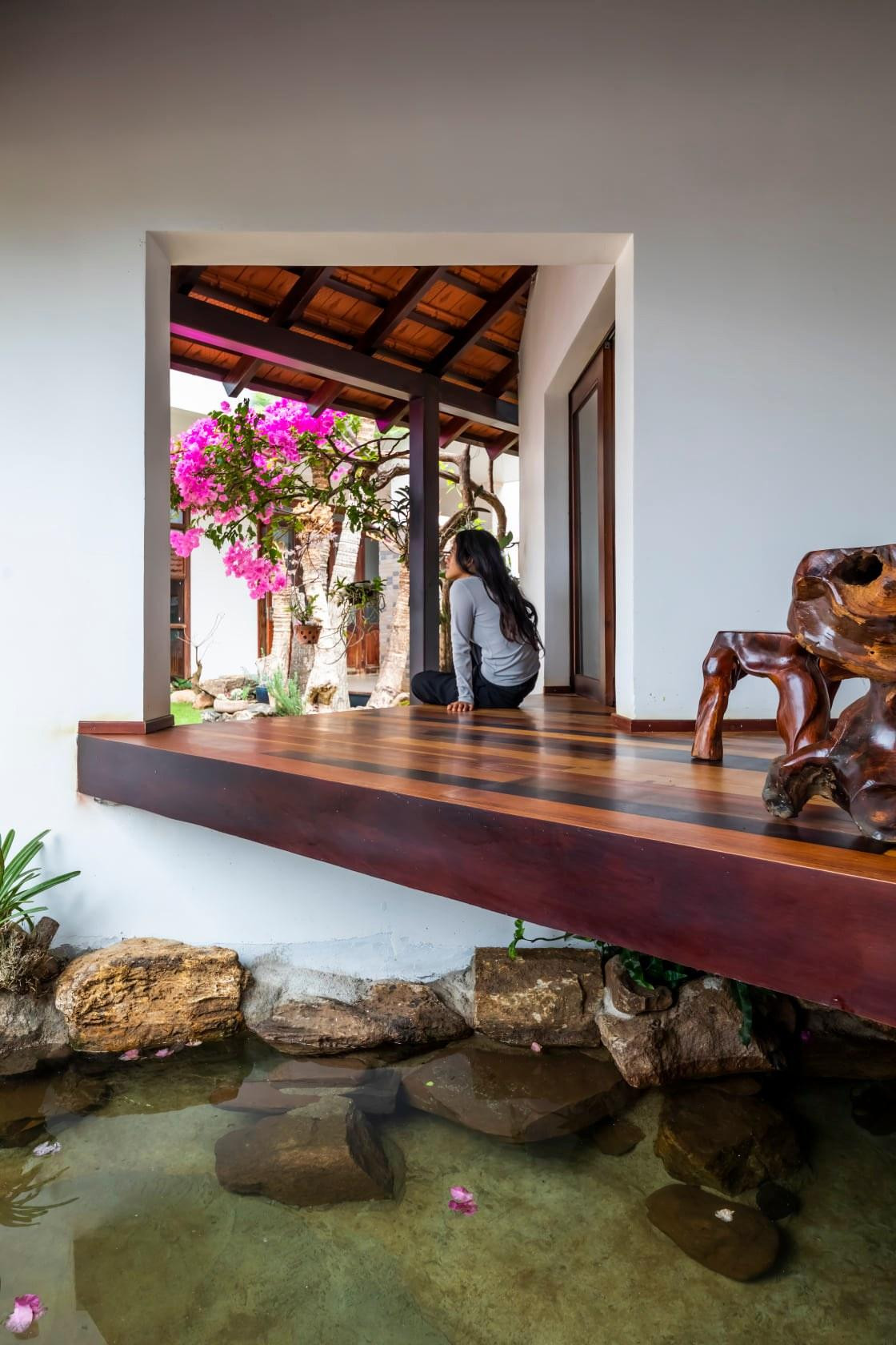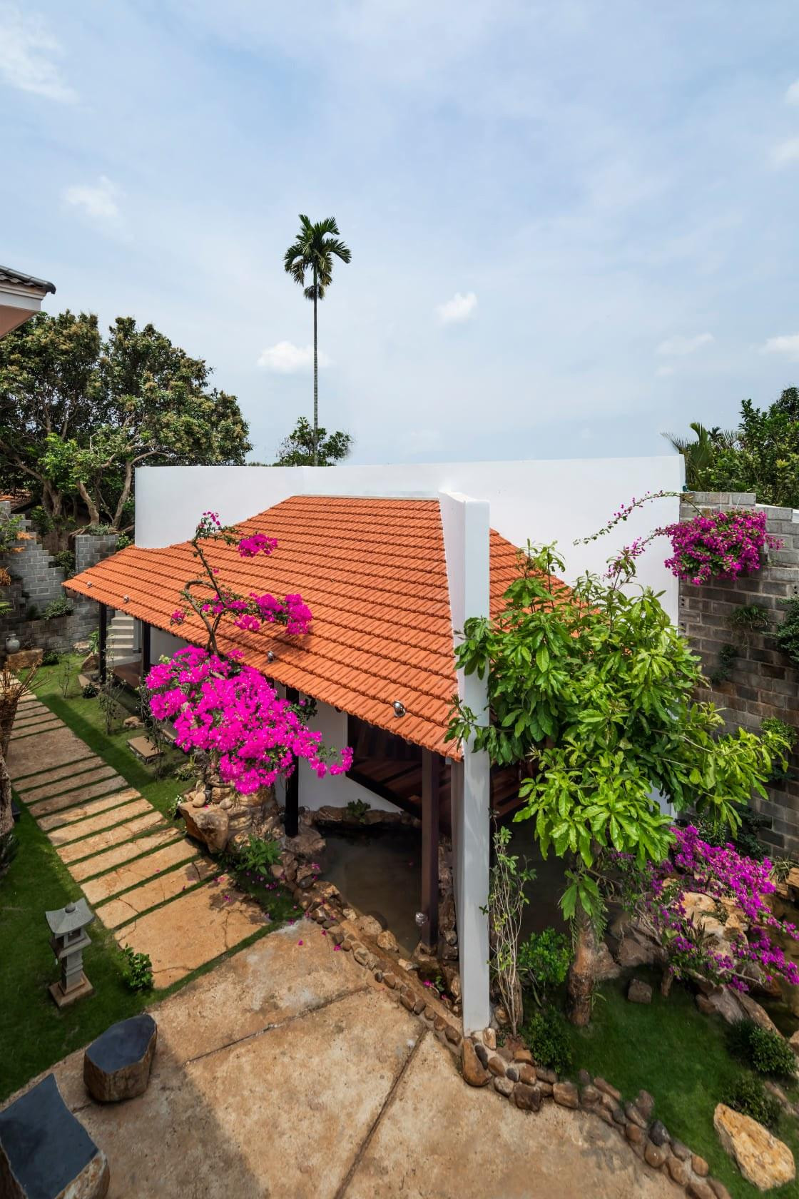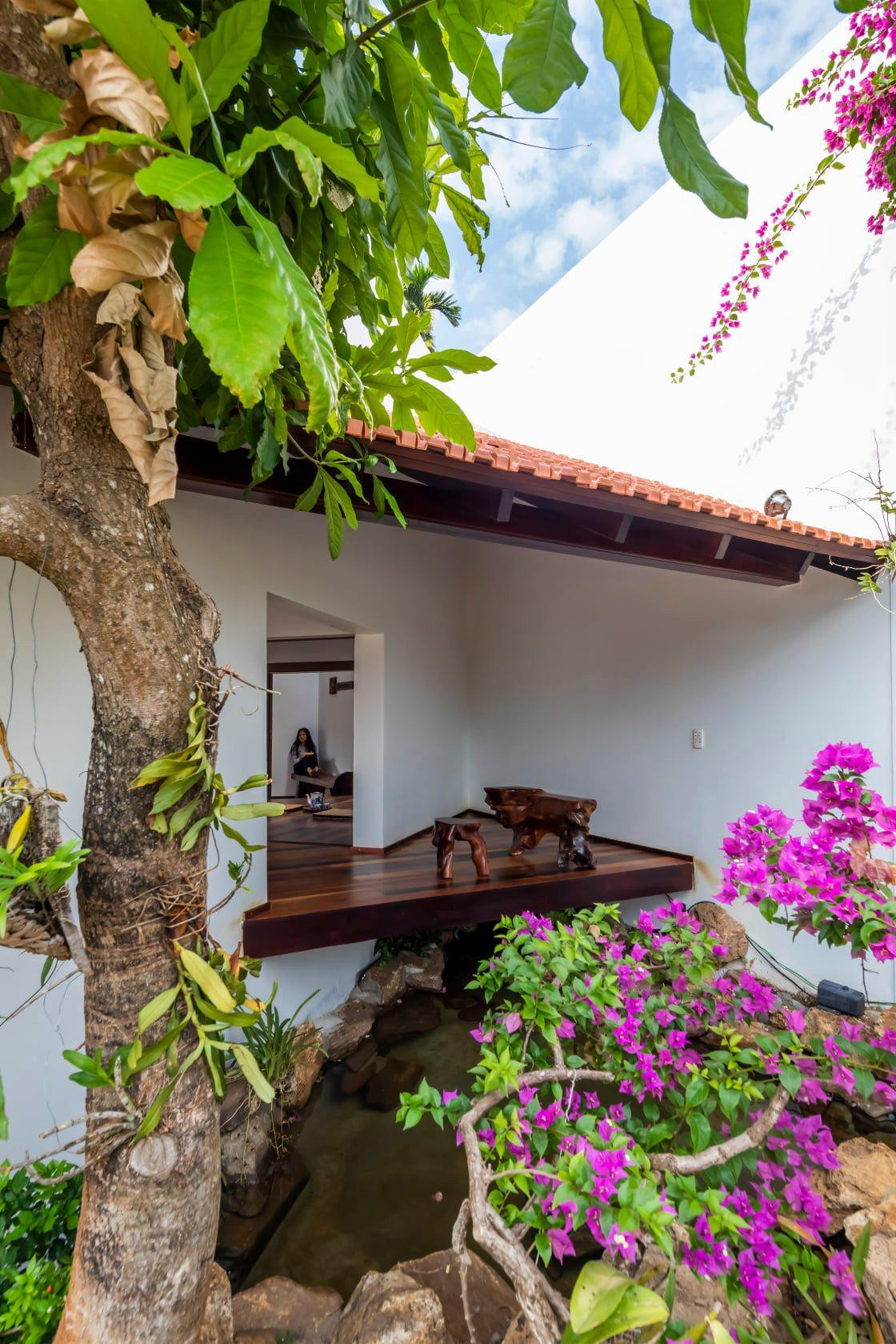 | Đặc biệt, công trình tạo hiệu ứng độc đáo, ấn tượng nhờ sự kết hợp, đan xen với giàn hoa giấy và tiểu cảnh hồ nước. |
