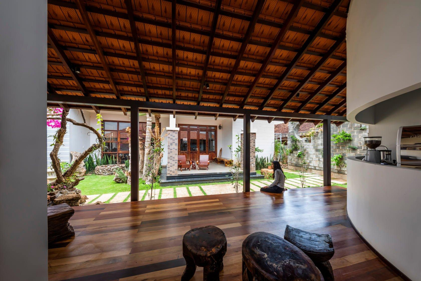 | Hệ mái được phát triển dài theo khu đất, song song và mở về phía gian nhà chính của gia đình để tăng sự kết nối giữa 2 không gian. |