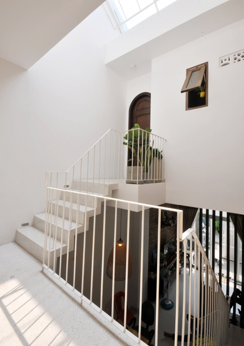 Màu sắc các bậc thang và tay vịn cùng sắc trắng giúp không gian nhà như rộng rãi hơn.
