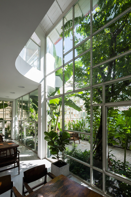Trong nhà chỉ có màu trắng, nâu gỗ và sắc xanh của cây nhưng không bị nhàm chán bởi có bóng nắng lung linh, cành lá rung nhẹ trong gió hay tiếng chim hót ríu rít sớm mai.