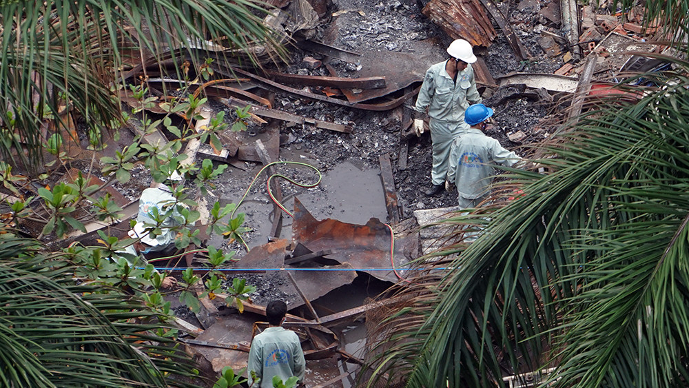 Các công nhân vệ sinh môi trường đang thu gom phế thải còn lại sau vụ cháy. Ảnh: Hoàng Mạnh Thắng