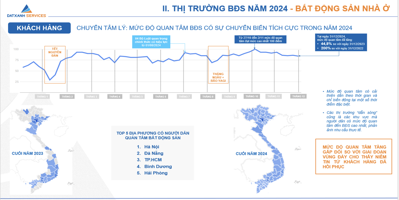 Theo thống kê của Dat Xanh Services - FERI, năm 2024 xu hướng tìm kiếm bất động sản từ Google trend đã có sự tăng trưởng đáng kể. Cụ thể, mức độ quan tâm bất động sản ghi nhận tại ngày 31/12/2024 đã tăng 44% so với cùng kỳ năm 2023, tăng 200% so với cùng kỳ năm 2022.