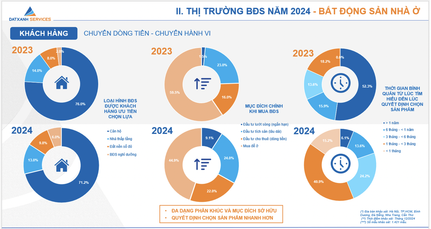 Khảo sát của Dat Xanh Services - FERI về mục đích chính khi mua bất động sản của khách hàng đã có sự chuyển dịch, khi tỷ lệ khách hàng mua để ở vẫn là xu hướng chủ đạo trong năm 2024 chiếm 44,9%, có sự điều chỉnh giảm so với tỷ lệ 59,5% của năm 2023.