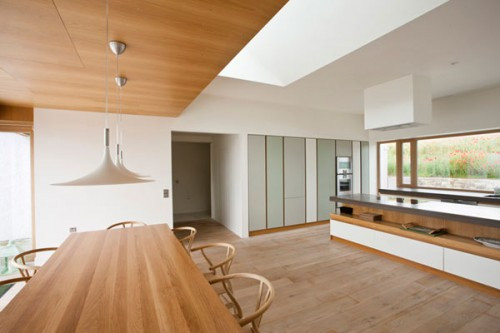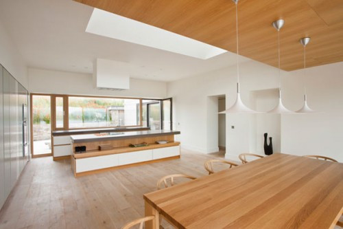 Phòng bếp và khu vực ăn uống với thiết kế thông thoáng không sử dụng vách ngăn đã làm cho không gian thêm rộng rãi. Toàn bộ khu vực nội thất đều được trang trí hiện đại với màu sơn trắng và ốp gỗ trên các bức tường đã tạo cho ngôi nhà thêm hiện đại và quý phái.