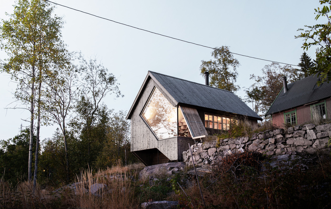 Mặt tiền ngôi nhà được thiết kế một khối kính đa giác lệch để vừa bắt trọn được khung cảnh thiên nhiên vừa tránh được các cơn gió mạnh quần thảo trên ngọn đồi.