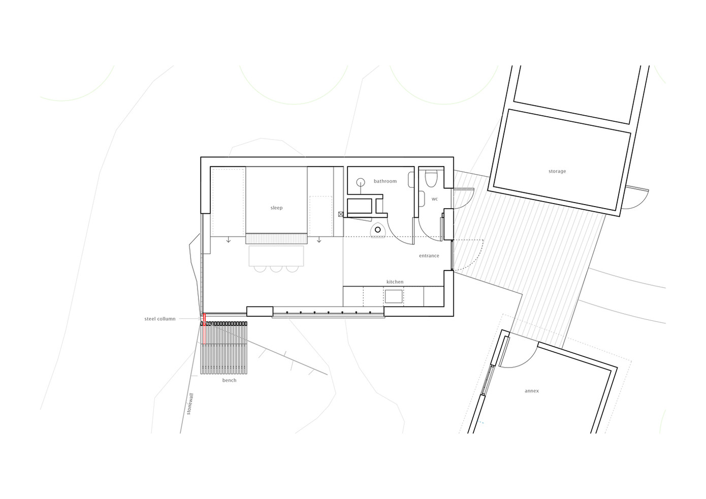 Ngôi nhà nhỏ có kết cấu hoàn toàn bằng gỗ được dựng ở lưng đồi với phần móng là 6 bu-lông được khoan chặt vào đá. Ngôi nhà có đủ các tính năng cần thiết nhất cho cuộc sống sinh hoạt cơ bản.