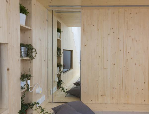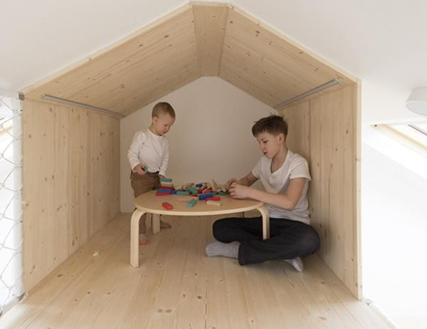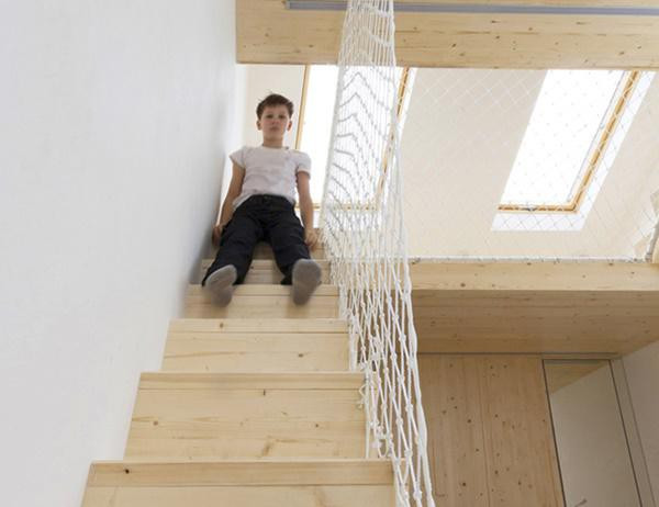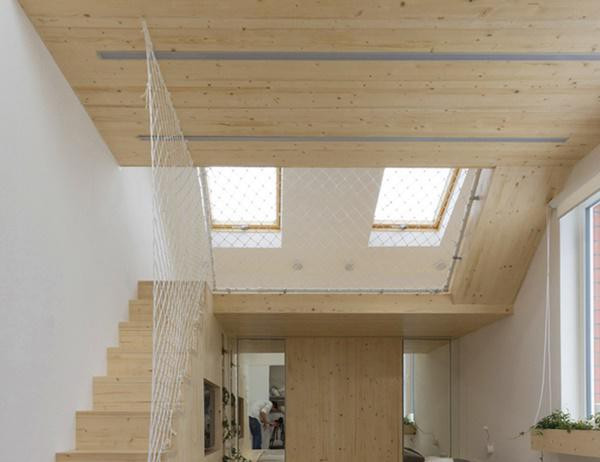 Điểm nhấn nổi bật của ngôi nhà chủ yếu là chất liệu gỗ, ngăn các tầng, các phòng, nhờ đó một gia đình 2 vợ chồng và trẻ nhỏ vẫn có khoảng không cách biệt riêng tư, các tấm lưới đặc biệt cũng giúp bảo đảm an toàn trong lúc lũ trẻ vui chơi, học tập.