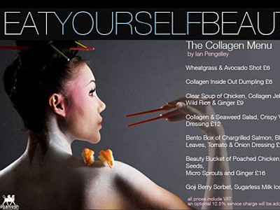 Tất cả những món ăn ở đây đều là những chất đạm không mùi, không màu được chiết xuất từ rong biển, thịt loài động vật có vú, chân lợn và da gà. Do collagen dễ bị phân hủy trong môi trường a xít amin trong dạ dày nên các nhà khoa học nghi ngờ về loại thực phẩm giàu collagen của nhà hàng này. Nhưng bếp trưởng của nhà hàng khẳng định khách hàng sẽ nhìn thấy ngay kết quả.
