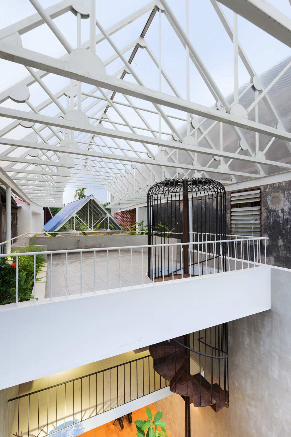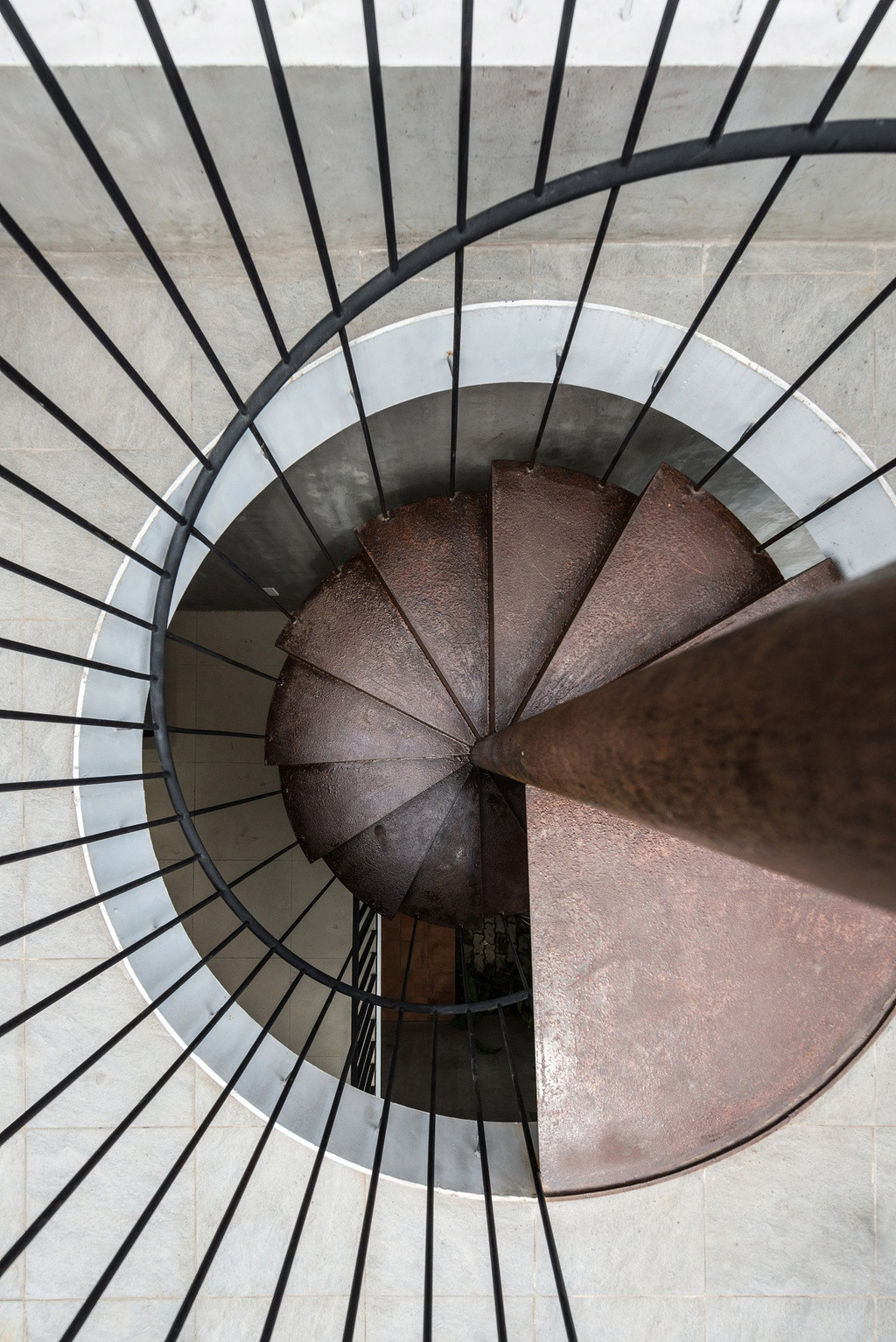 Cầu thang xoắn có điểm kết thúc như một chiếc lồng chim lớn trên sân thượng.