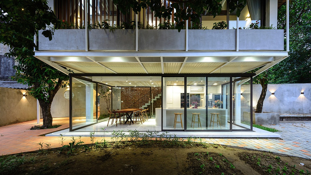 Ngôi nhà được thiết kế với mặt tiền giống những nhà phố thường thấy, lớp tường xây bằng gạch kính.