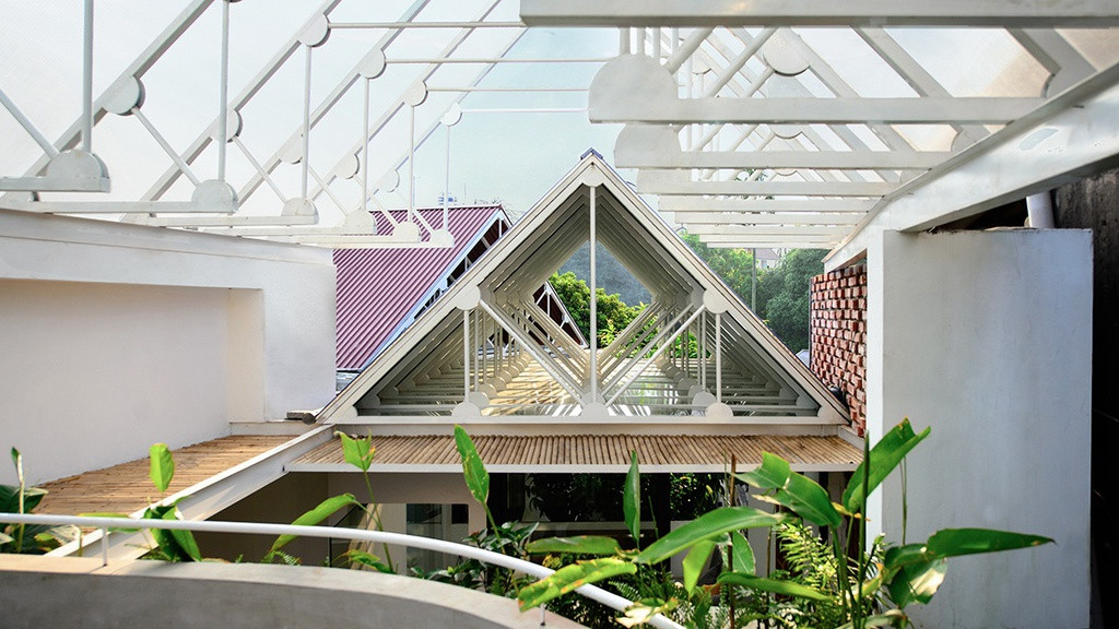 Mái nhà được gia cố bởi giàn vì kèo thép. Mái nhà nhỏ dành cho mặt tiền, mái lớn chồng lên bên trên dành cho khu vườn trên cao bí mật của chủ nhà.