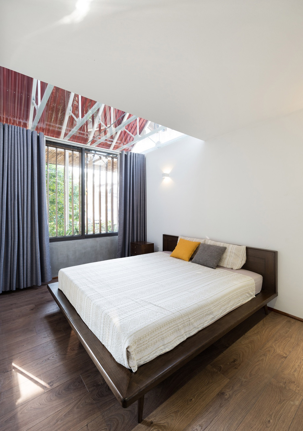 Phòng ngủ đơn giản nhưng lạ lẫm bởi khoảng lấy sáng bên trên như một giếng trời nhỏ.