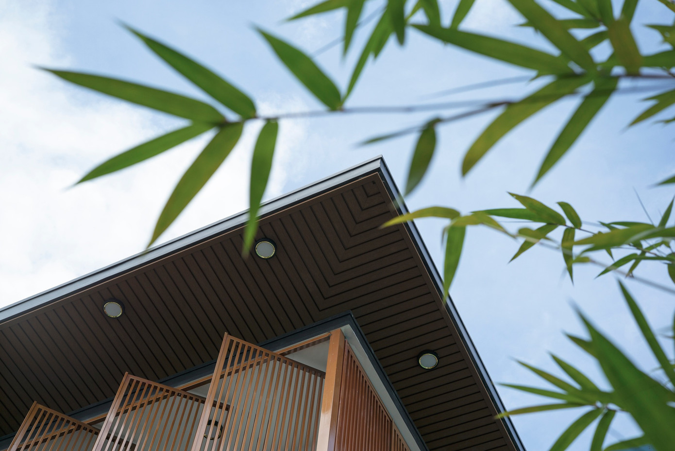 Mặt tiền bố trí hệ lam trang trí đón gió và tạo hiệu ứng ánh sáng. Ngoài ra mặt tiền còn được phủ nhiều cây xanh để giảm bớt sự khắc nghiệt của thời tiết.