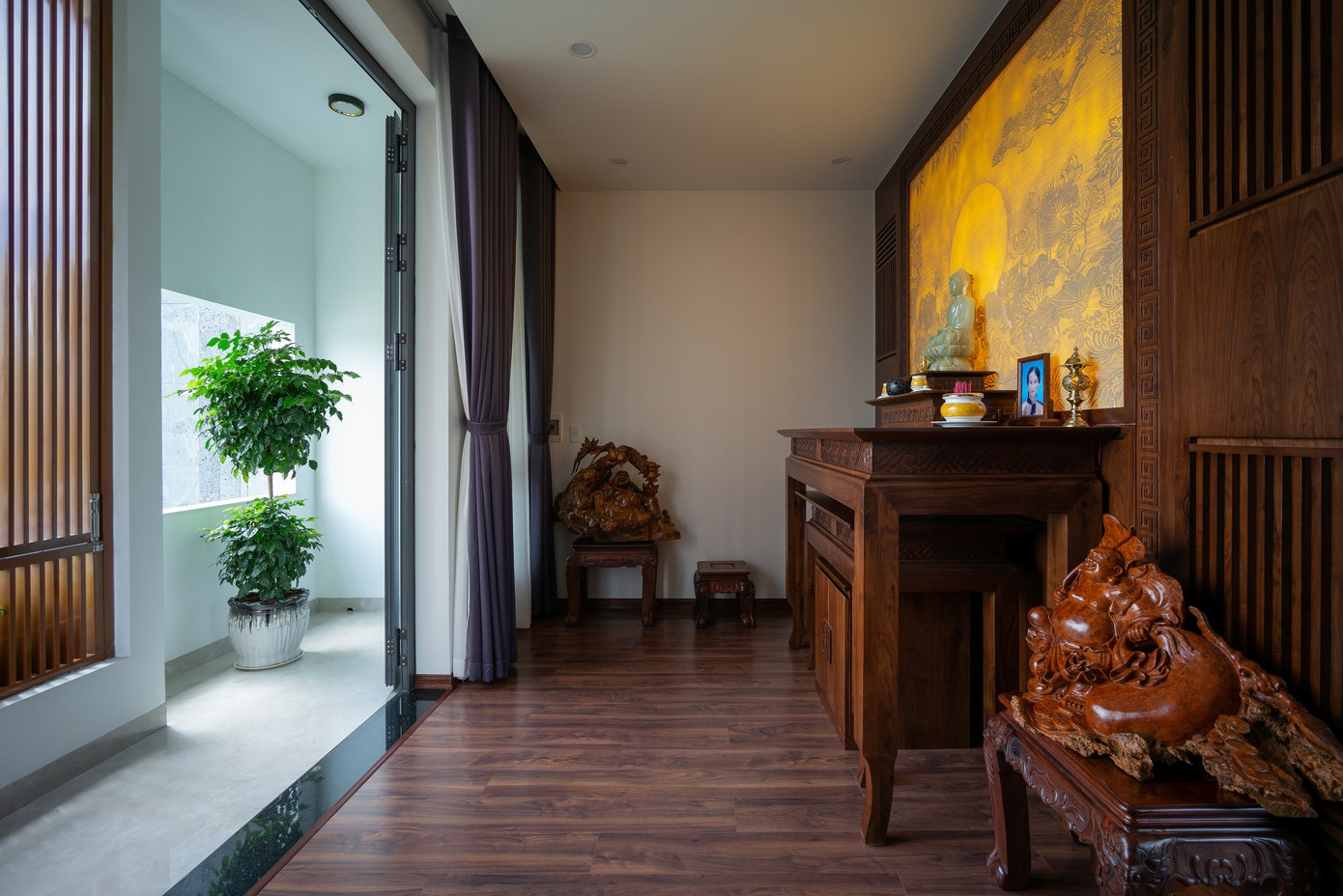 Công năng chính bao gồm 1 khách + bếp; 3 phòng ngủ; phòng thờ; khu tiểu cảnh giếng trời; vệ sinh; sân trước và sau.