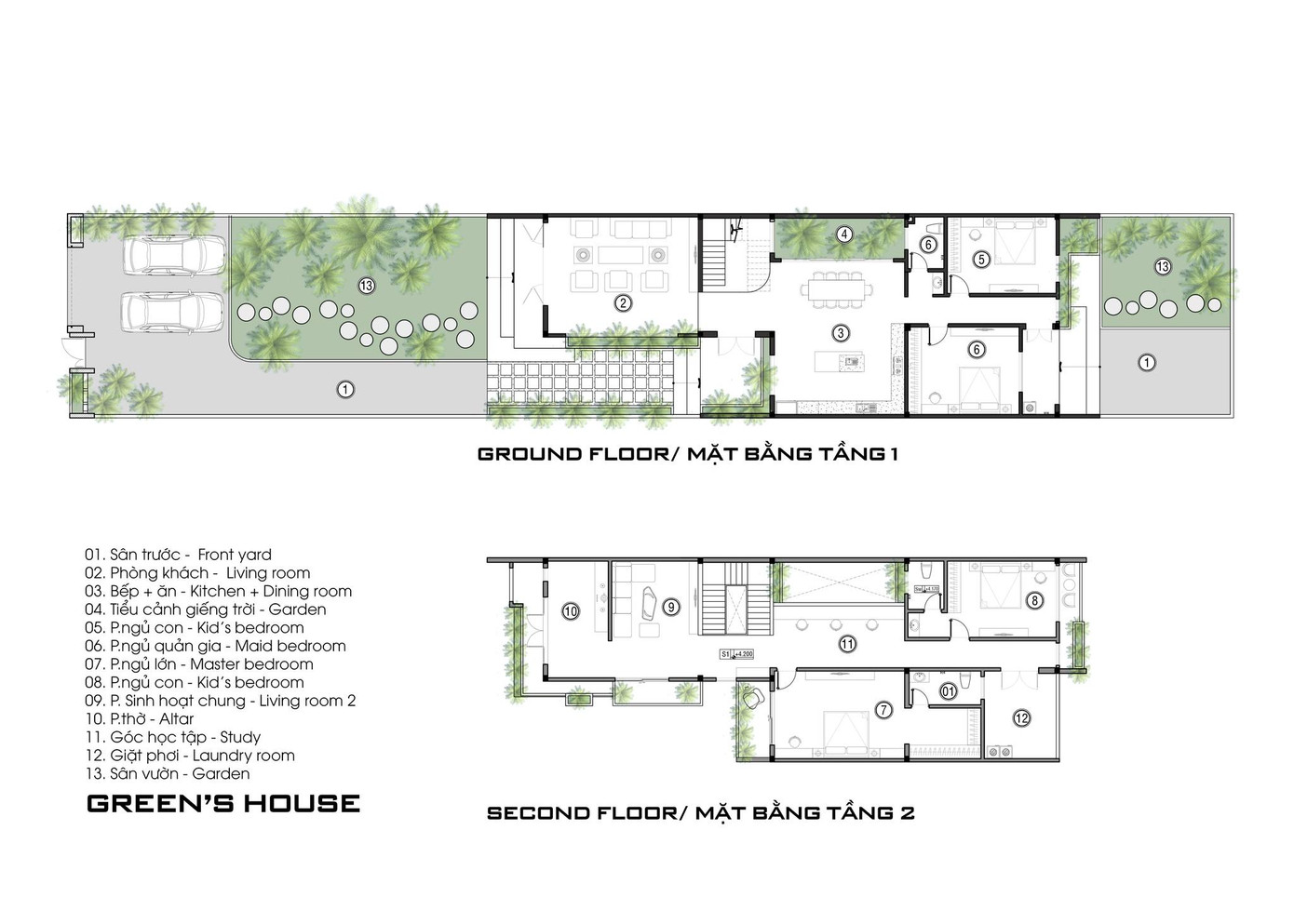 Giếng trời và cây xanh cũng được bố trí ở các góc trong nhà để phòng nào cũng lấy sáng được và giúp điều hòa không khí.