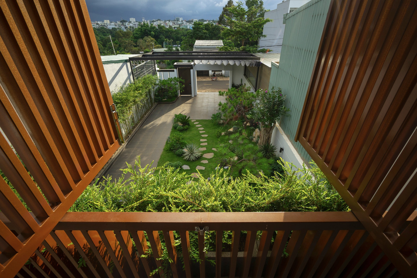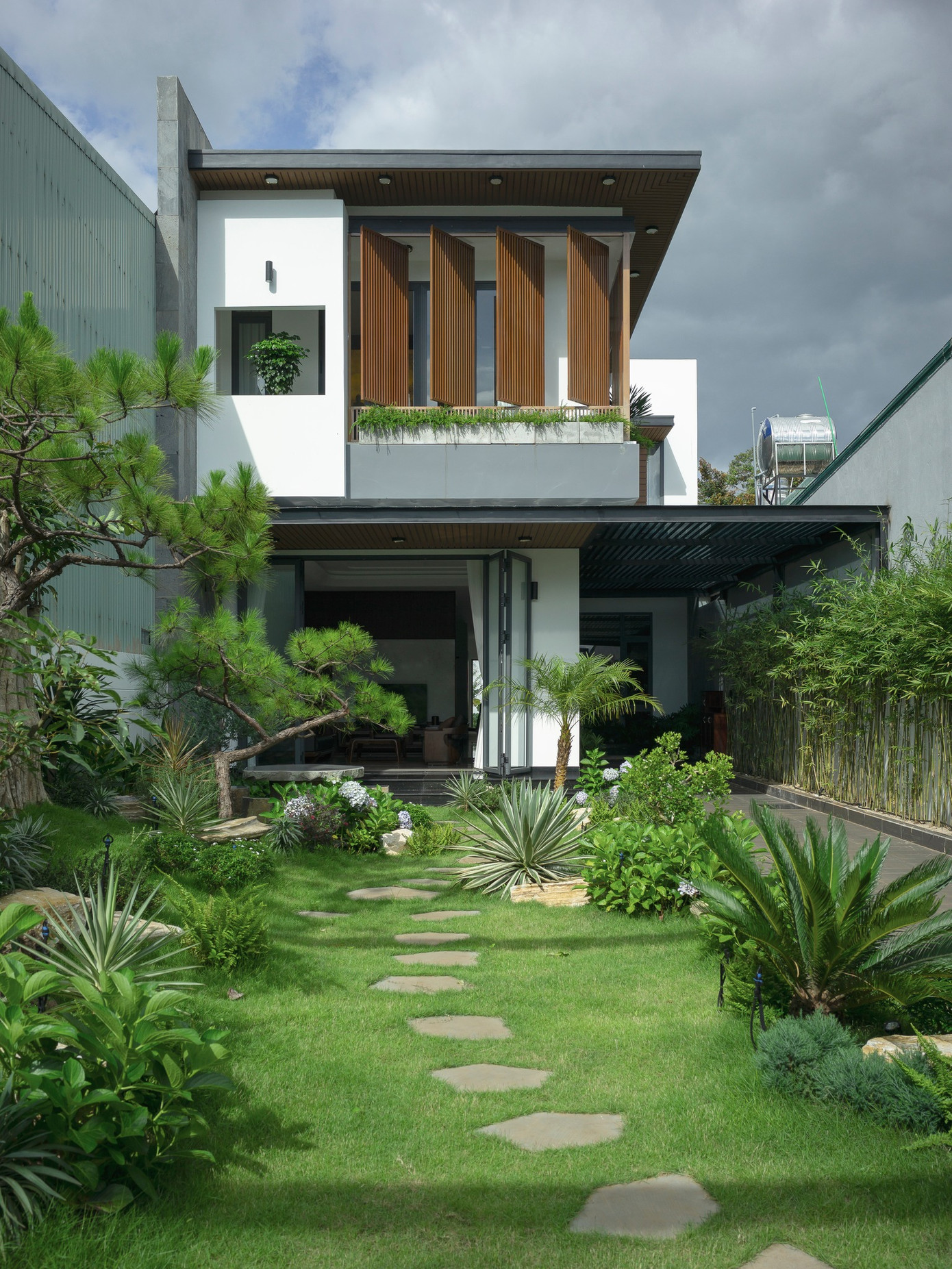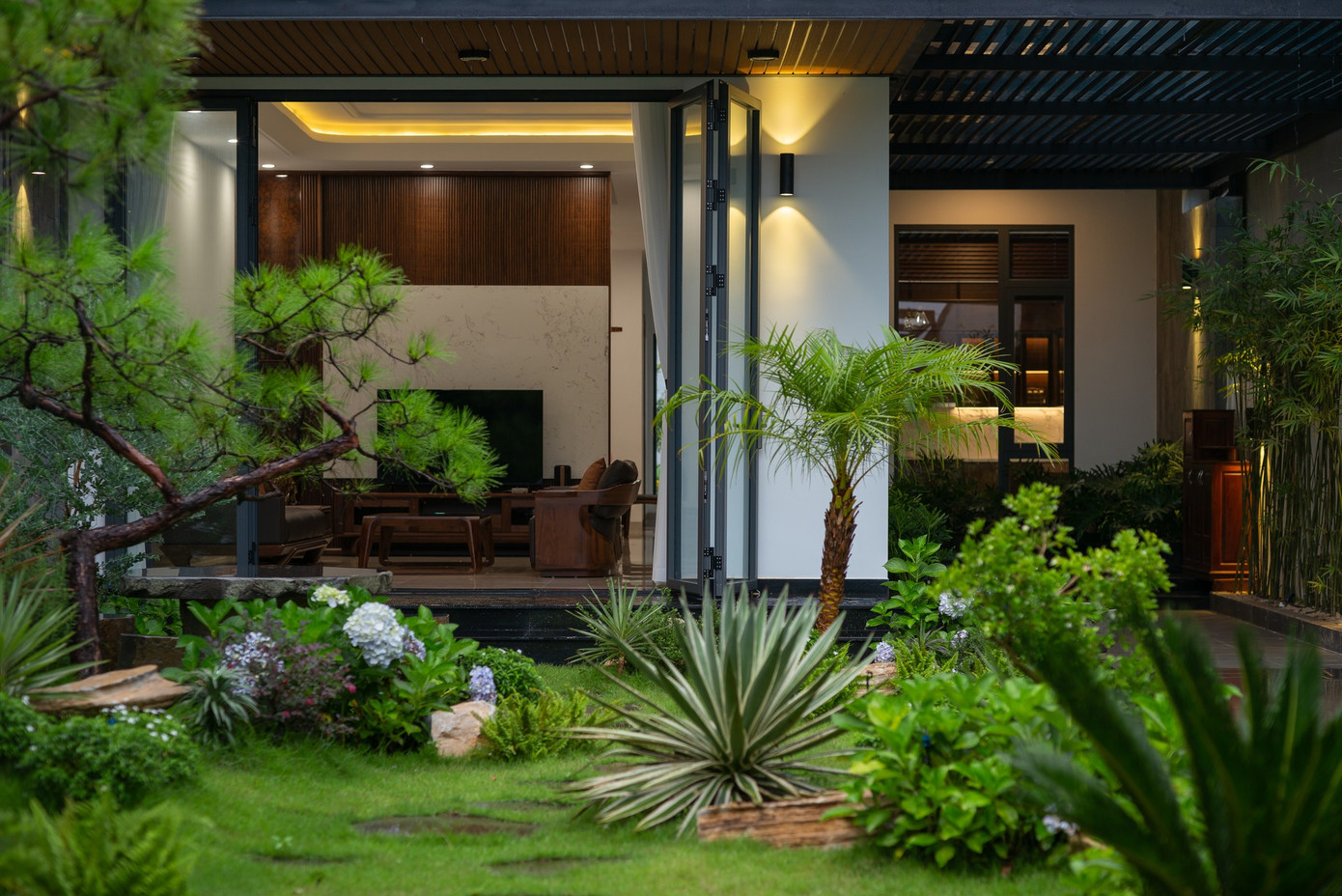 Khu vực sân vườn được bố trí hài hòa phủ xanh toàn bộ phần sân trước, vừa có tác dụng cản nắng gió hướng Tây làm giảm bớt lượng nhiệt vào bên trong, vừa đem lại tính thẩm mỹ cao cho ngôi nhà khi có thêm 1 cảnh quan đẹp và hài hoà trong khuôn viên.
