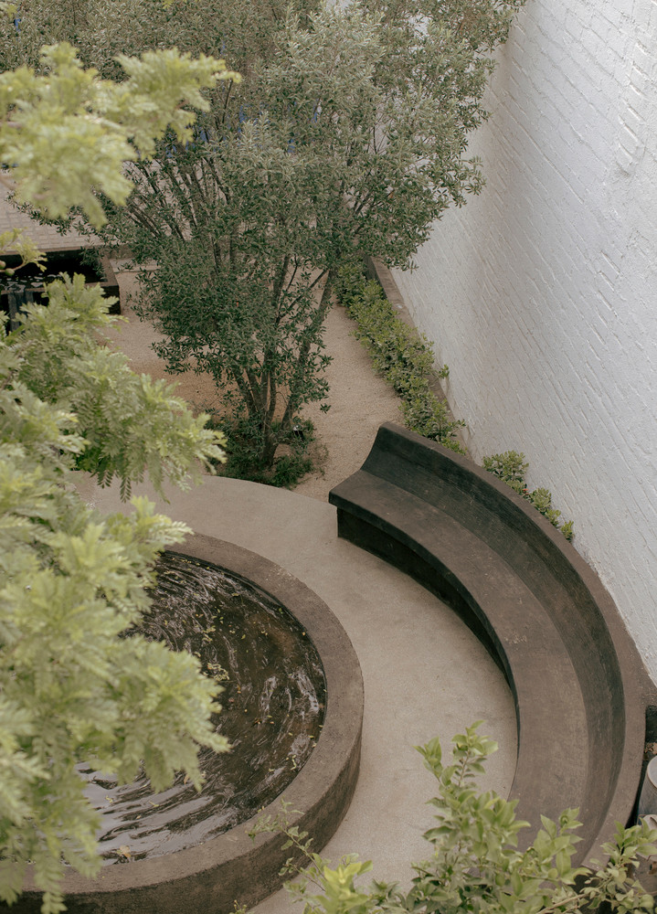 Trái ngược với bề ngoài đóng kín, bên trong căn nhà được thiết kế mở với sân vườn ở trung tâm, tạo khoảng giao thoa giữa kiến trúc, tự nhiên và con người.