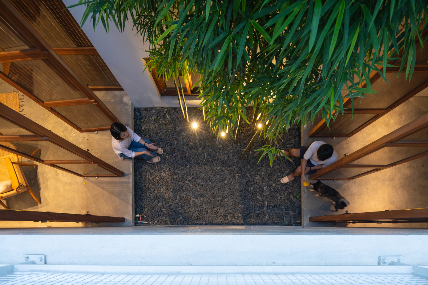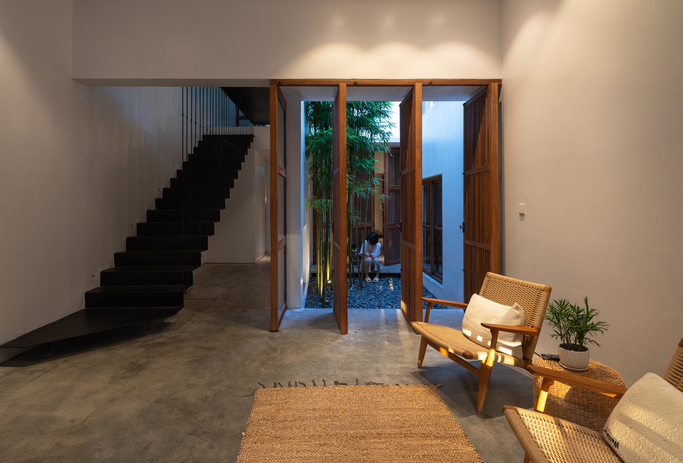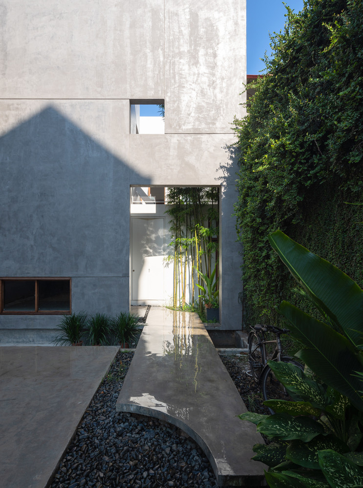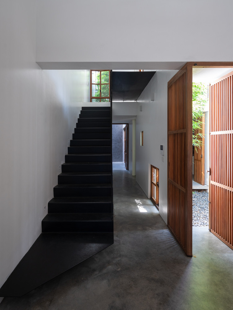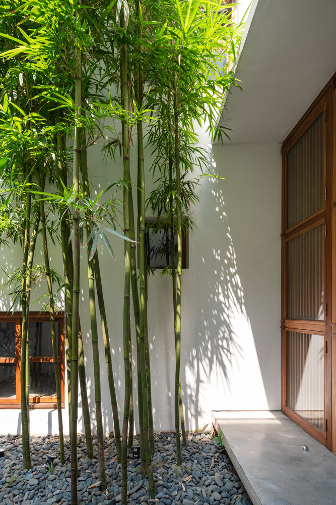 TPO - Tre xuất hiện trong cả 3 khoảng sân, đóng góp màu xanh và những đường nét mạnh mẽ vào tổng thể kiến trúc ngôi nhà. Gỗ là một trong những vật liệu chính được sử dụng trong nội thất.