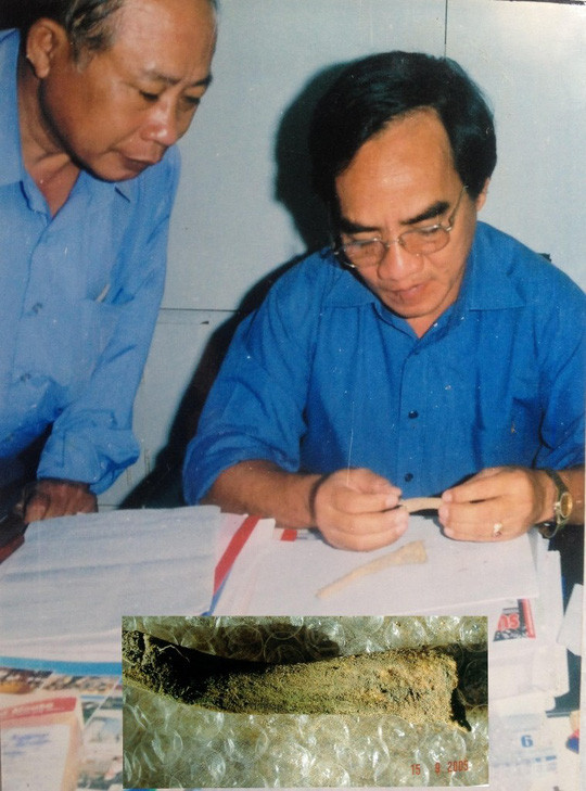 Khi khảo sát hài cốt nam giới, mọi người nhận thấy hai chiếc xương đòn gánh (hay còn gọi là xương quai xanh ở bả vai), xương bên trái còn nguyên nhưng xương bên phải bị gãy do một vật nhọn tác động (là kiếm hoặc mũi tên) làm gãy xương này. Đặc biệt đoạn xương bị gãy này có màu xanh đồng, khác biệt hoàn toàn với những mảnh xương khác đều không có màu xanh như vậy. Đoàn đã bảo quản mảnh xương này, gửi ngay về khoa Giải phẫu ĐH Y Dược TP.HCM để phân tích và đích thân GS-BS Phan Bảo Khánh là trưởng khoa đã đi xuống thực địa để nghiên cứu và ông kết luận: "… Chủ nhân có thể đã bị tử thương. Ở vết thương bị vỡ không bình thường và chất độc ở vết thương đã làm cho đoạn xương bị phản ứng đổi từ màu trắng của xương thành xanh đồng…".
