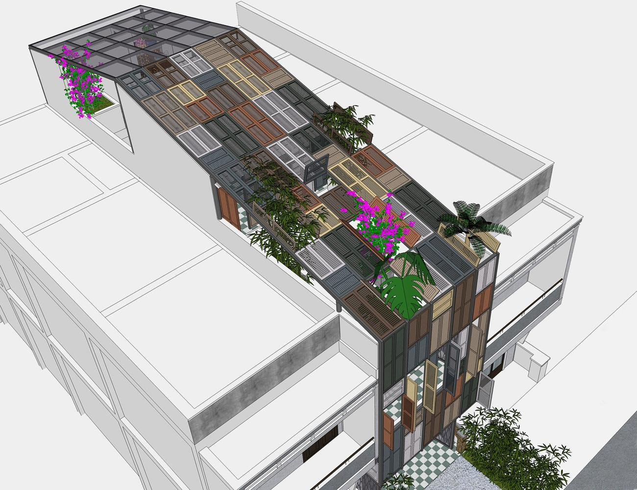 | Các cửa sổ cũ được sử dụng làm vật liệu chính để tạo ra một diện mạo đặc biệt cho ngôi nhà. Theo đó, các ô cửa gỗ với nhiều màu sắc khác nhau được bố trí xen kẽ để che đi mặt tiền cũ cũng như bao bọc phần tầng thượng, tạo nên một sức hút hài hòa. |