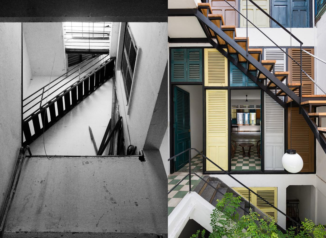 | Một cầu thang thép mới được xây dựng bên cạnh giếng trời lên tầng hai, nơi từng là một mái nhà không sử dụng.