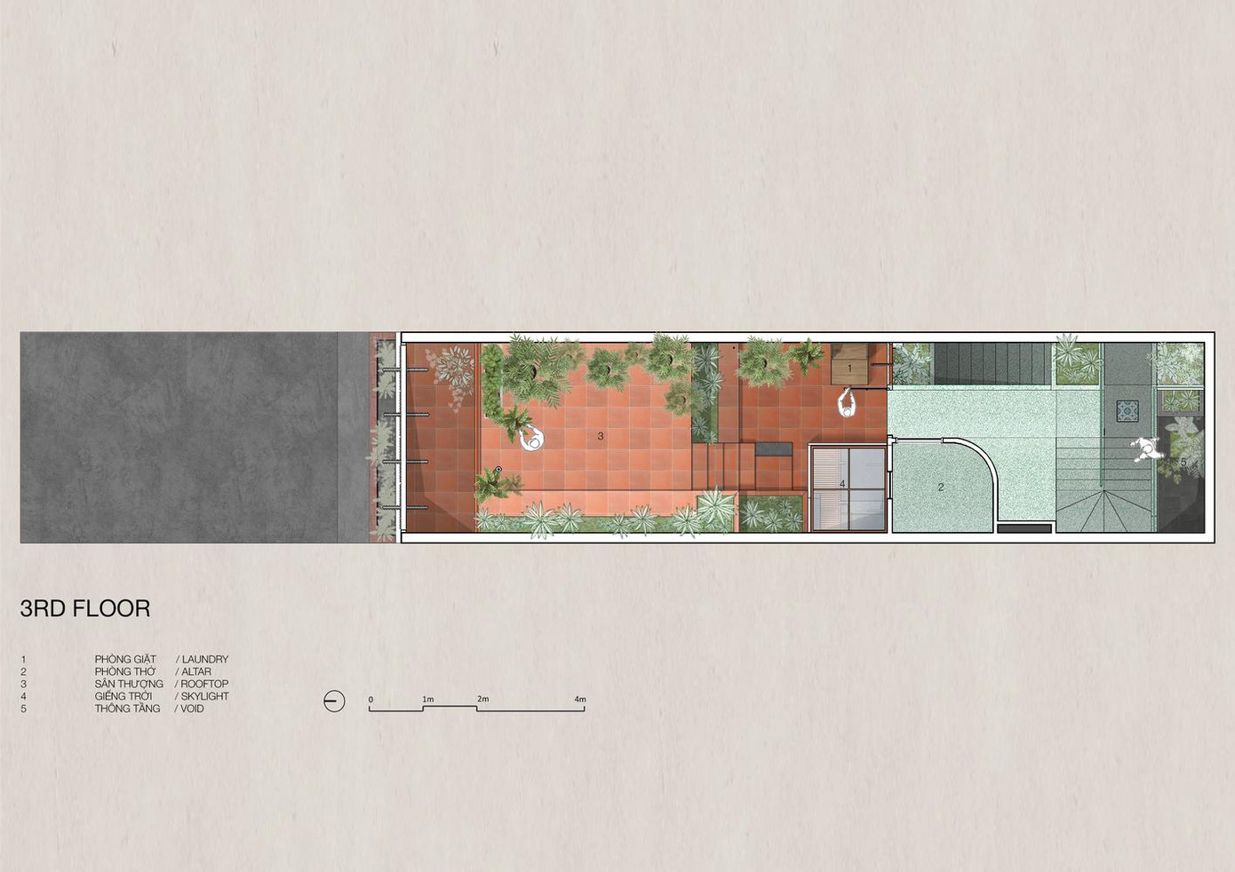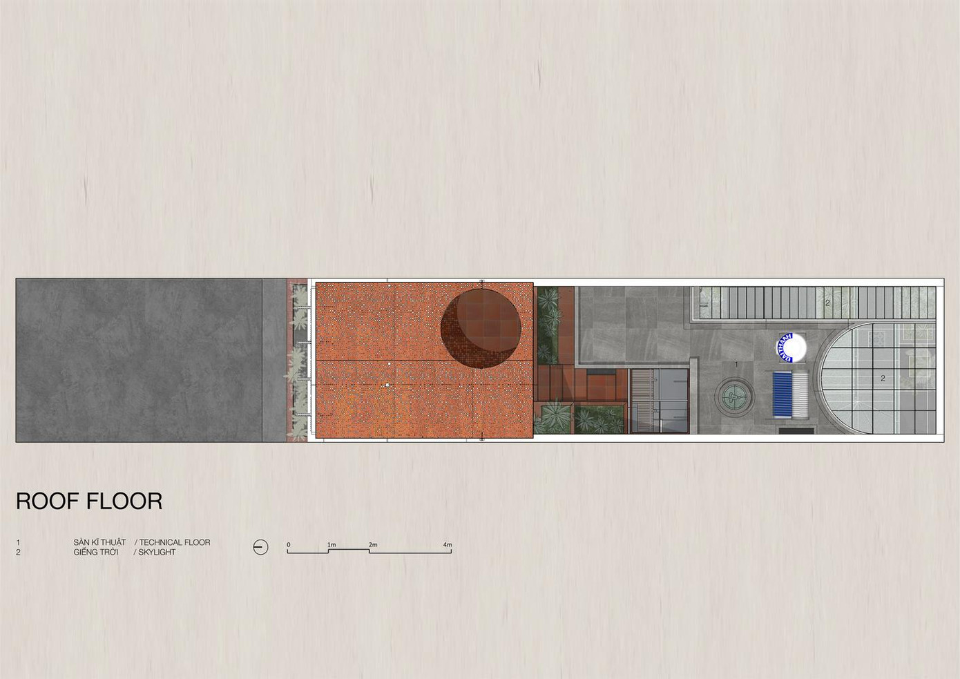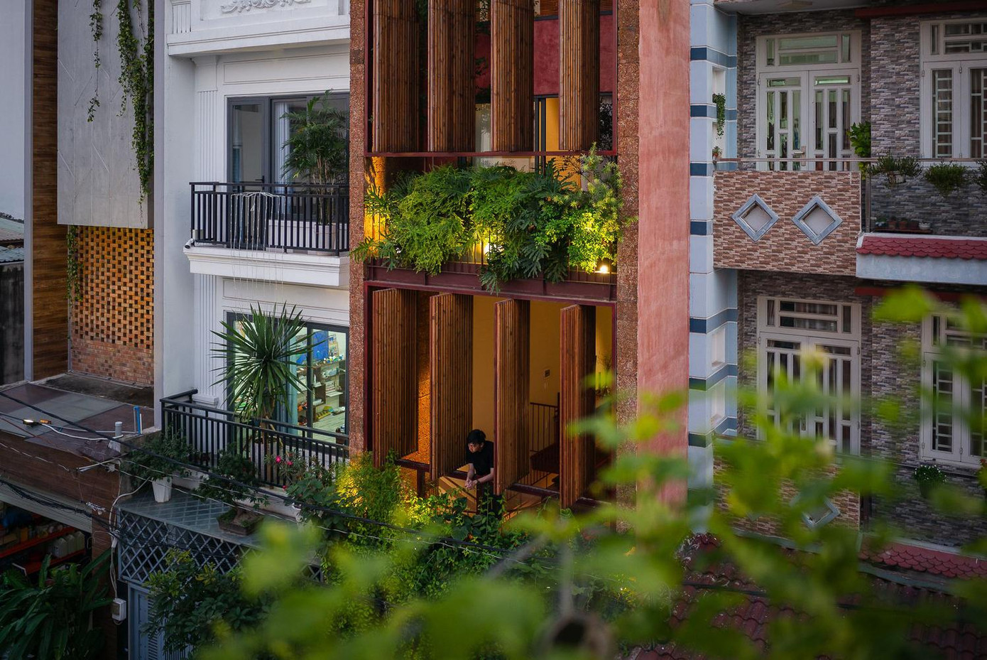 | Thiết kế được lấy cảm hứng từ những ngôi nhà truyền thống của miền Trung Việt Nam, với các lớp khác nhau, được sắp xếp theo cách mang lại sự rung cảm tích cực cho các hoạt động hàng ngày: mặt tiền của ngôi nhà (hệ thống cửa quay) - sân vườn (chuyển tiếp) - khu vực chính - giếng trời - hỗ trợ khu - giếng trời. |