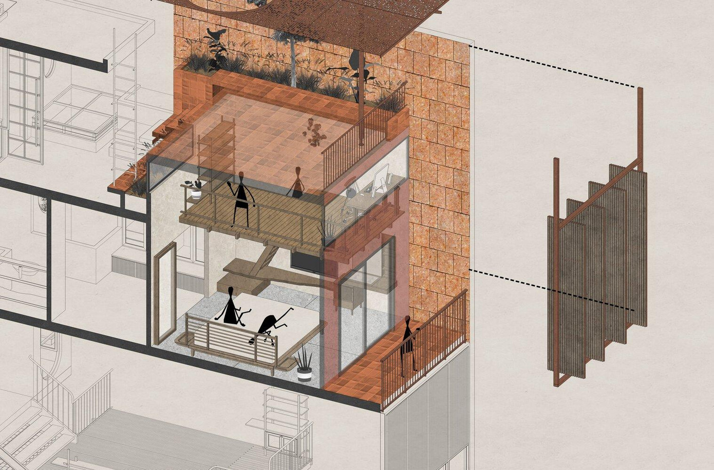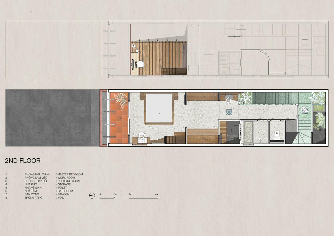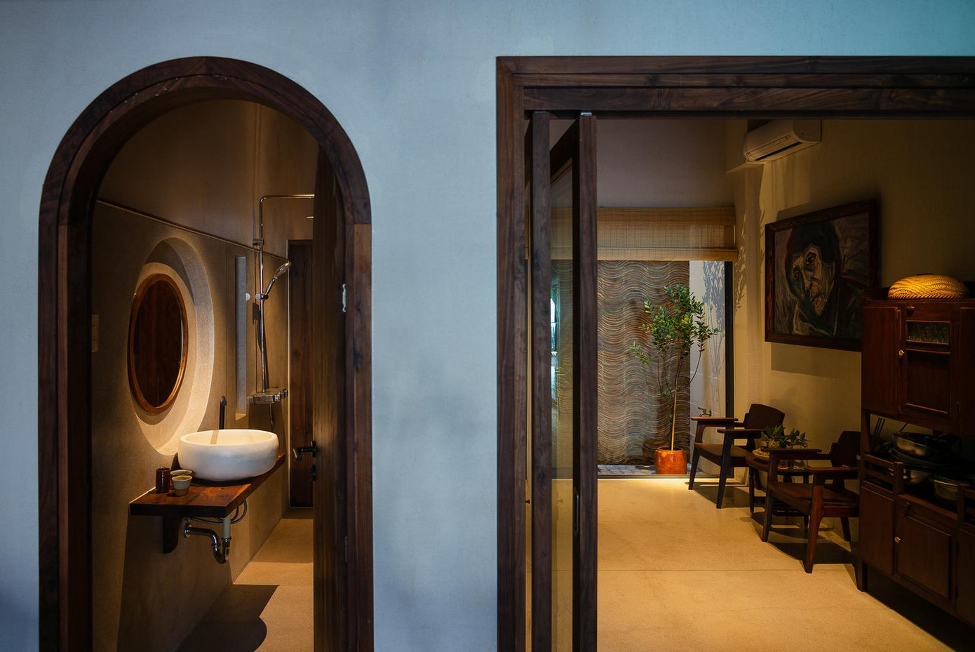 | Thiết kế được lấy cảm hứng từ những ngôi nhà truyền thống của miền Trung Việt Nam, với các lớp khác nhau, được sắp xếp theo cách mang lại sự rung cảm tích cực cho các hoạt động hàng ngày: mặt tiền của ngôi nhà (hệ thống cửa quay) - sân vườn (chuyển tiếp) - khu vực chính - giếng trời - hỗ trợ khu - giếng trời. |