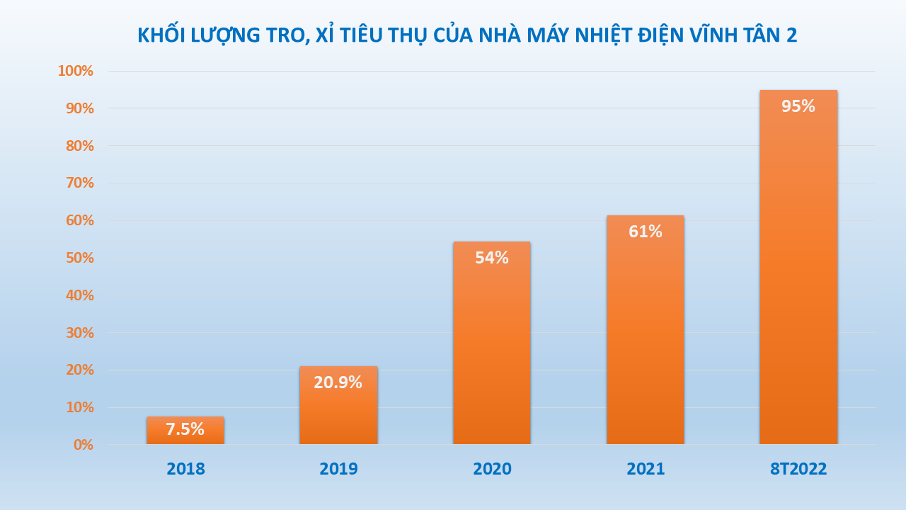Công ty Nhiệt điện Vĩnh Tân đã ký hợp đồng tiêu thụ tro xỉ với 7 đơn vị, với khối lượng cam kết khoảng 1,19 triệu tấn/năm, tương đương khoảng 91% tro, xỉ phát sinh (1,3 triệu tấn/năm). Khối lượng tiêu thụ tro, xỉ của Nhà máy Nhiệt điện Vĩnh Tân 2 đã tăng dần theo thời gian, từ 7,5% năm 2018 đến 20,99% năm 2019, 54,34% năm 2020, 61,3% năm 2021. Riêng trong 8 tháng đầu năm 2022, tổng khối lượng tro xỉ tiêu thụ của nhà máy trên 1,08 triệu tấn, đạt hơn 95%.
