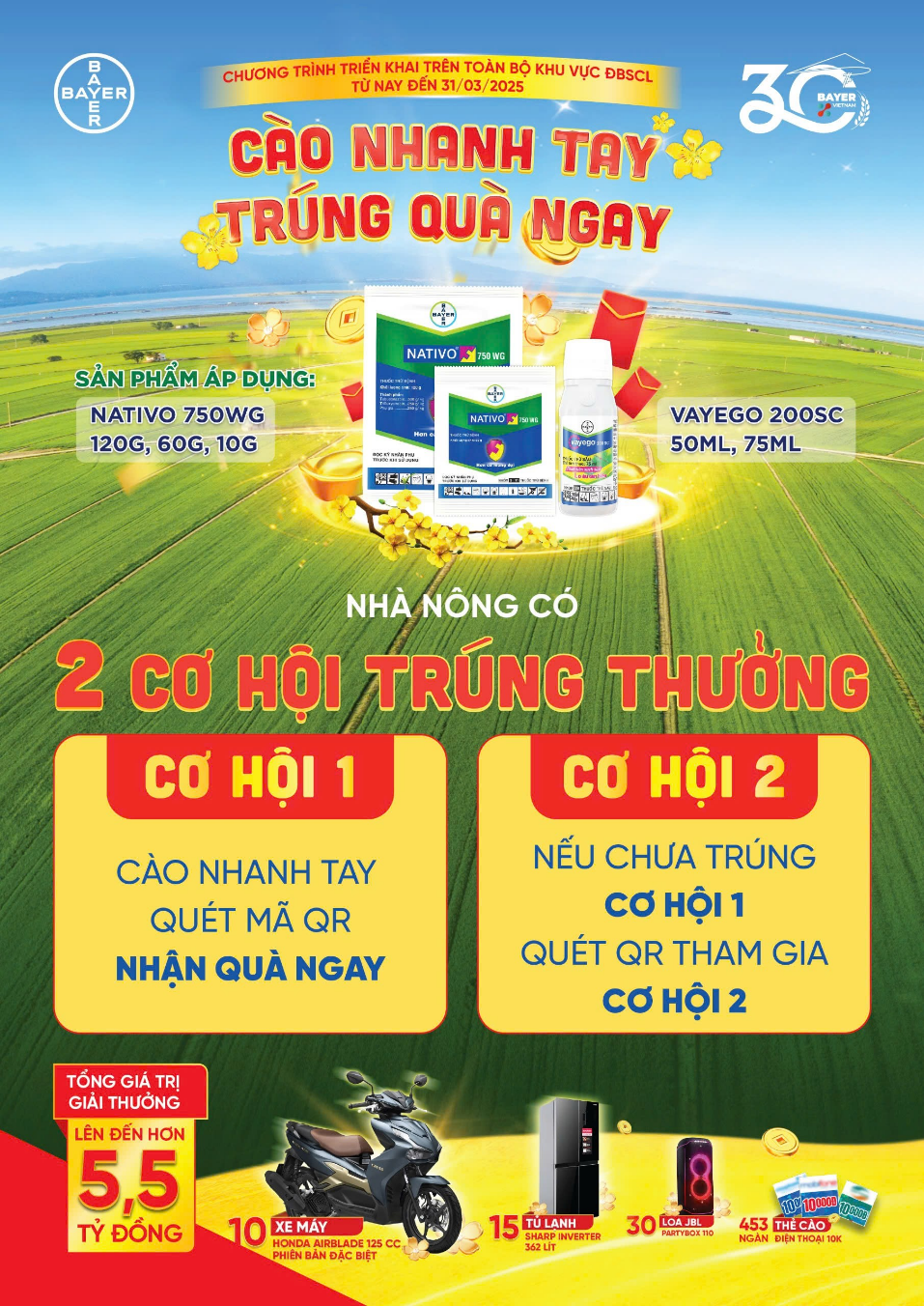 Chương trình “Cào Nhanh Tay, Trúng Quà Ngay” không chỉ là lời tri ân từ Bayer mà còn là cơ hội để nhà nông tiếp cận các sản phẩm chất lượng cao, giúp nâng cao năng suất cây trồng. Sự thành công của chương trình thể hiện rõ cam kết của Bayer trong việc đồng hành và hỗ trợ nhà nông trên hành trình phát triển nông nghiệp bền vững.