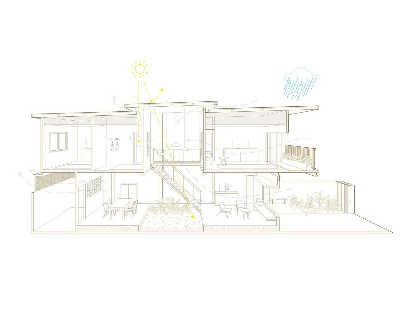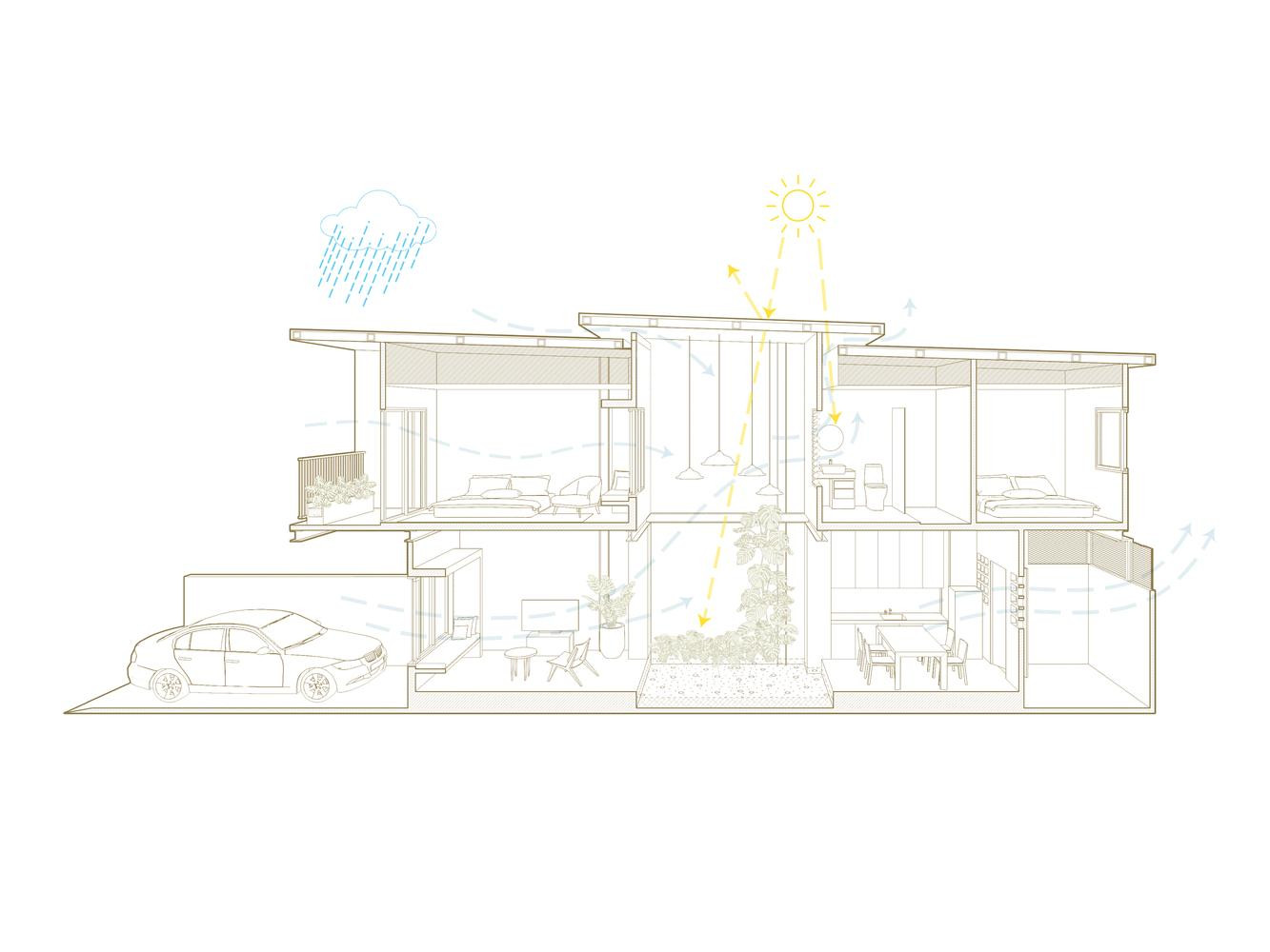 | Phòng khách và bếp được ngăn cách với nhau bằng một khu vườn giữa nhà ở bên dưới giếng trời. |