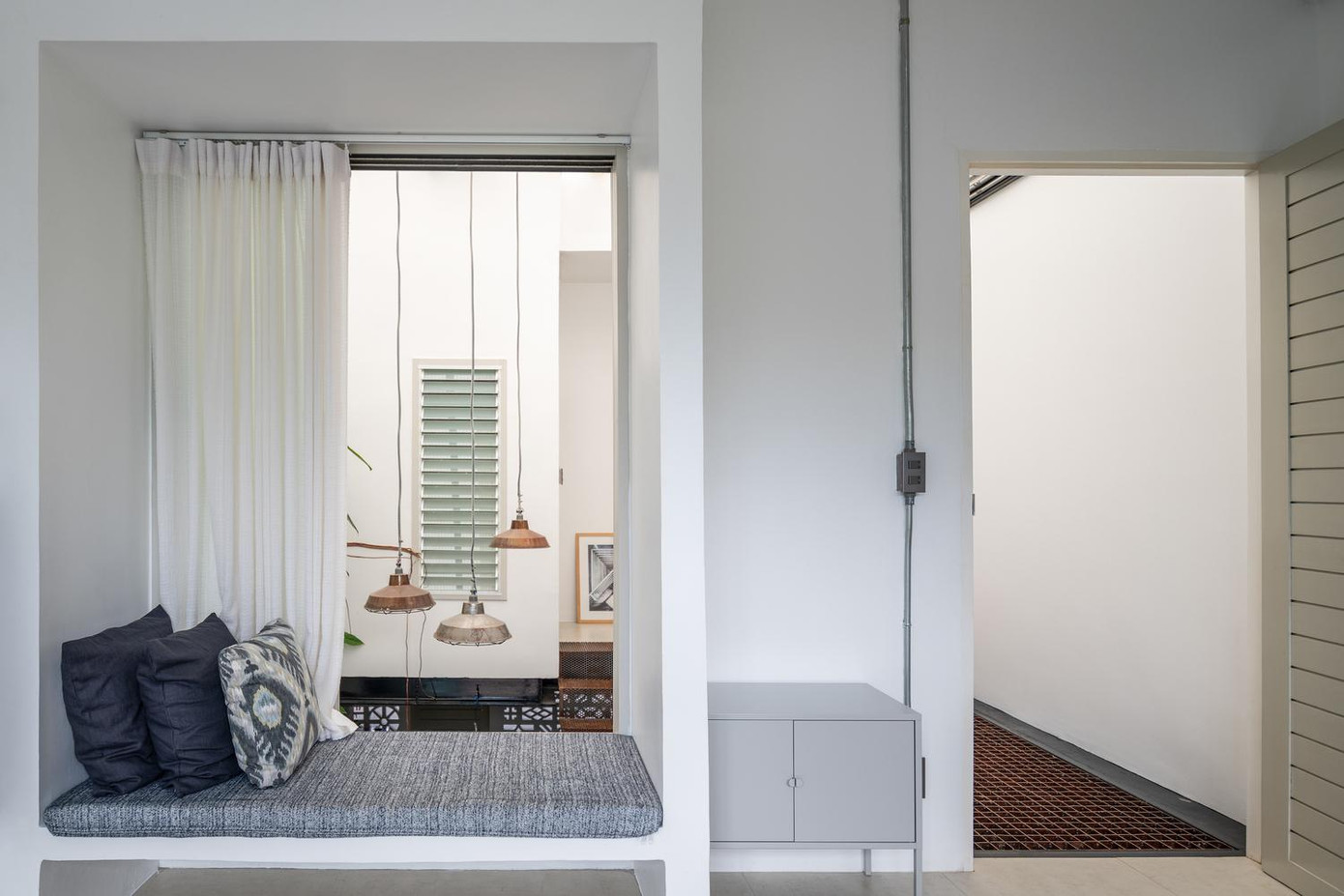 | Các cửa đều làm bằng kính trong suốt có rèm che, nội thất ưu tiên đồ gỗ để tạo cảm giác ấm cúng cho không gian. Bệ cửa sổ được thiết kế thấp, thuận tiện cho việc ngồi ngắm cảnh, đọc sách hoặc tán gẫu với bạn bè của cô chủ. |