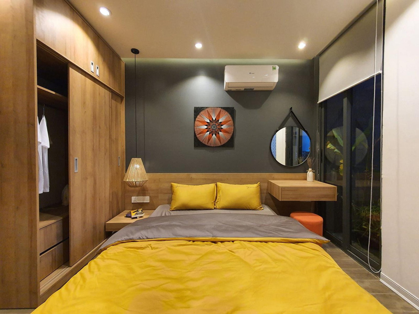 Gam màu vàng, xám tiếp chủ đạo trong phòng khách tiếp tục được lặp lại trong phòng ngủ.