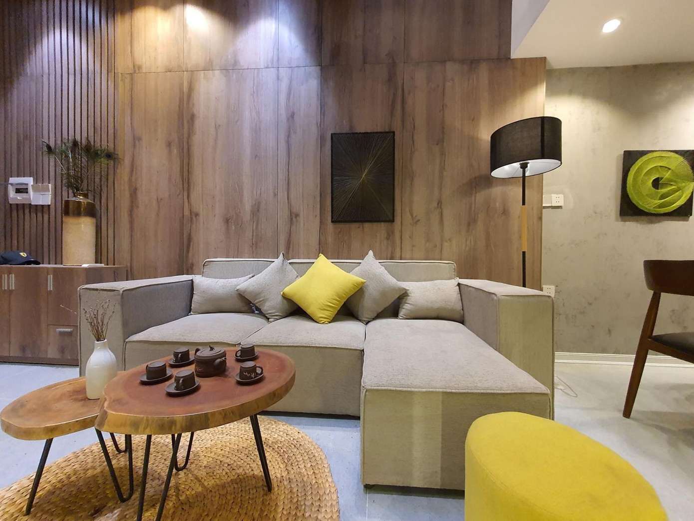 Phòng khách với tường ốp gỗ sang trọng và đẹp mắt.
