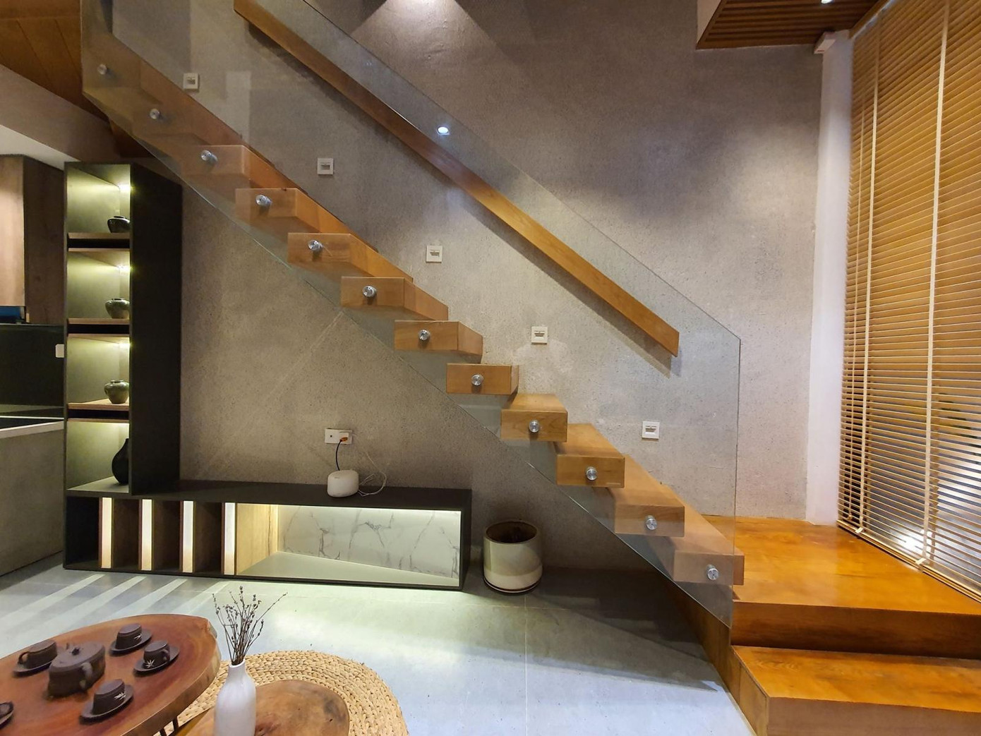 Cầu thang gỗ tự nhiên với thiết kế cầu thang đổ bản kết hợp cùng lan can kính tạo sự thông thoáng cho ngôi nhà.
