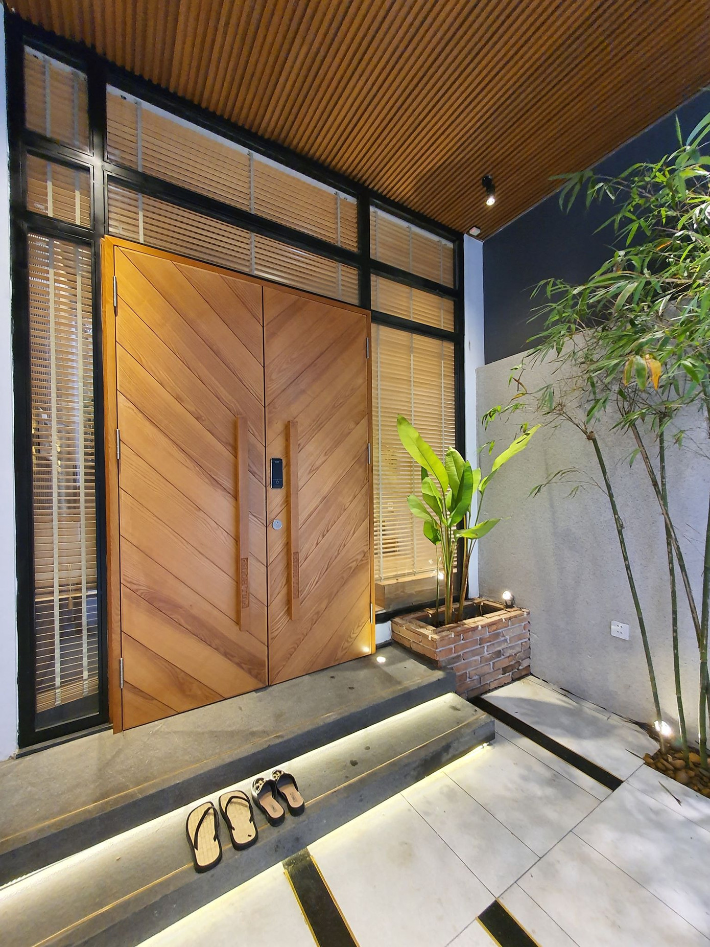 Mặt tiền hướng Tây nên cửa chính được đẩy sâu vào tạo khoảng đệm, vừa là nơi để xe, vừa hạn chế nắng chiếu trực tiếp vào buổi chiều.