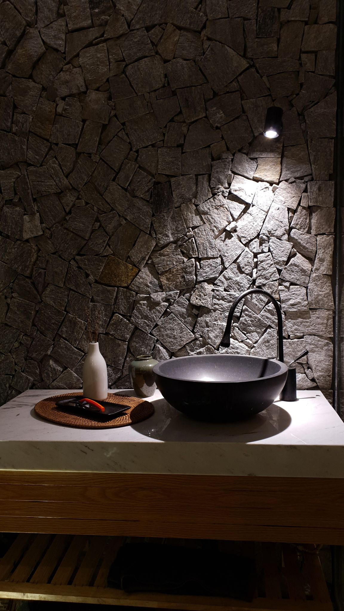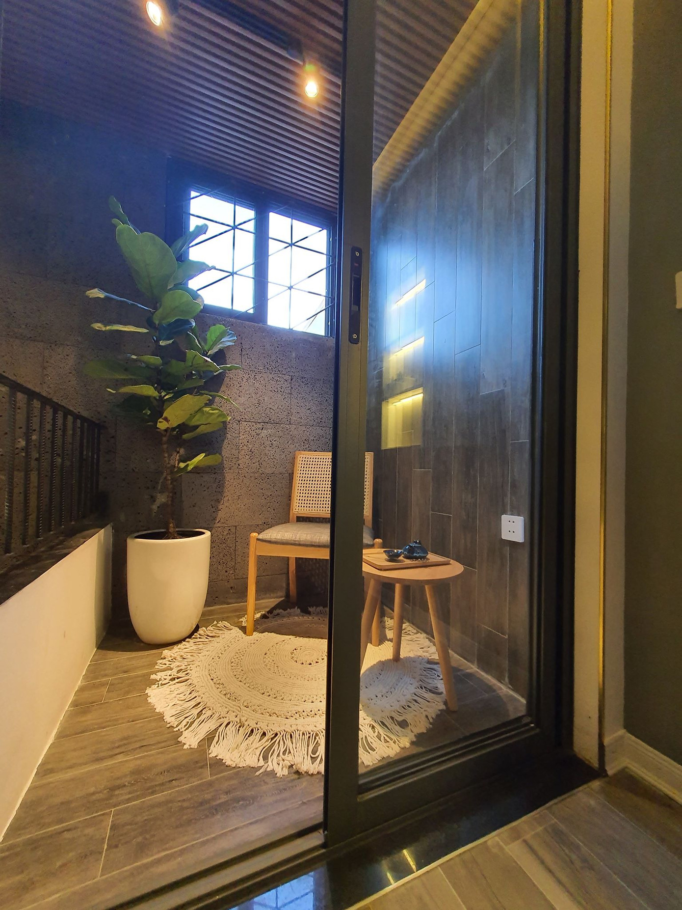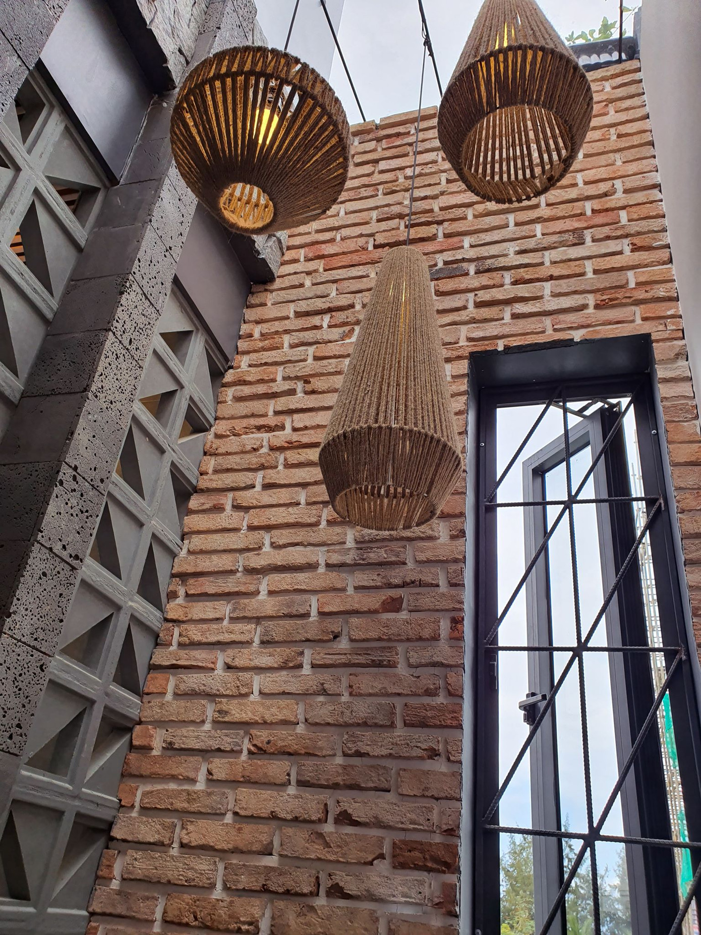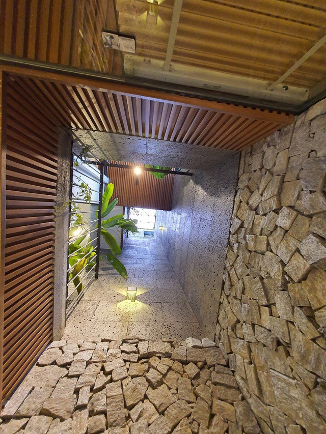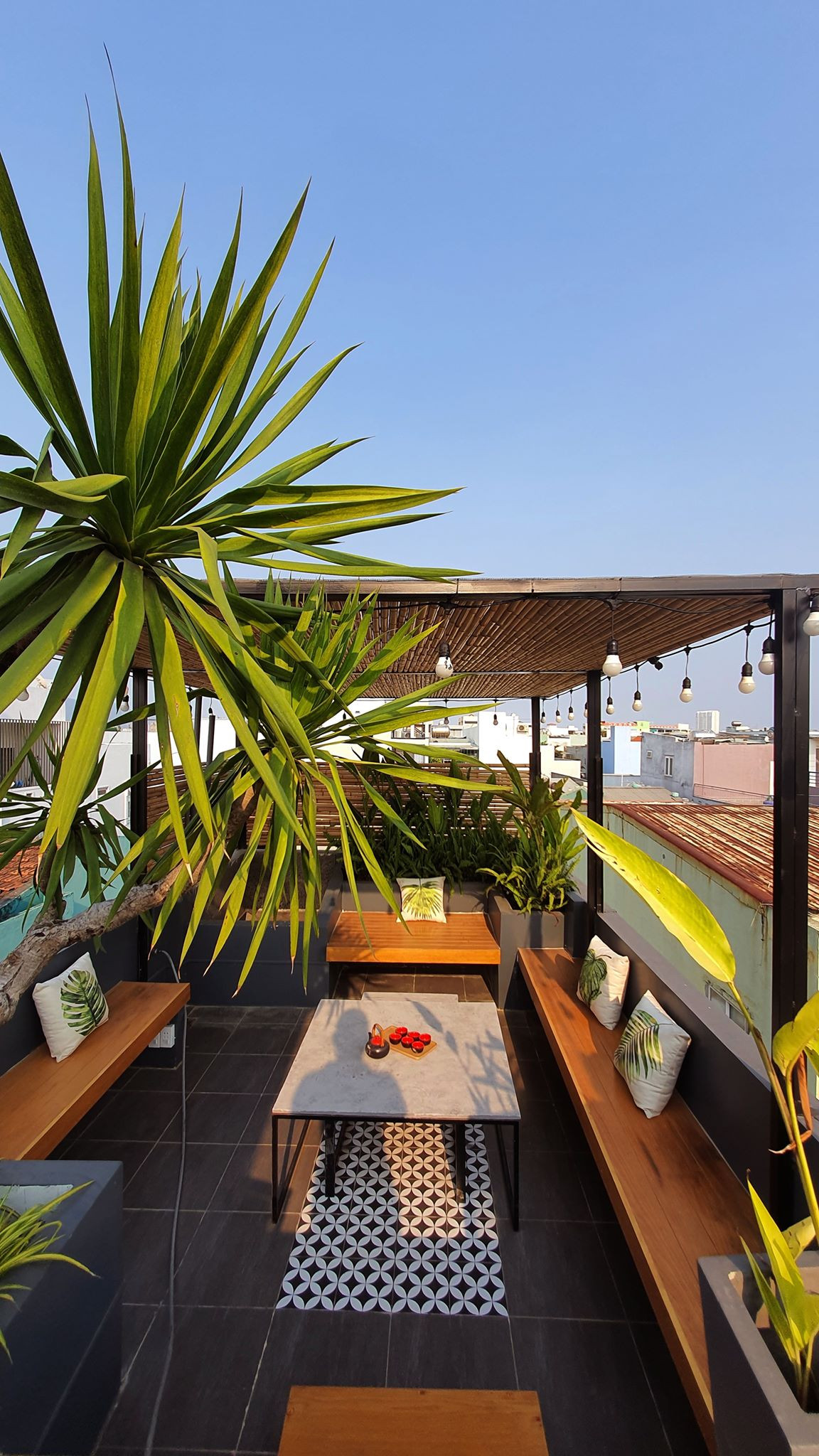 Những vật liệu thô mộc như tường sơn giả bê tông, gạch thẻ cổ, đá tổ ong cùng với vật liệu tre trên sân thượng mang lại cảm giác thô mộc, gần gũi với thiên nhiên.
