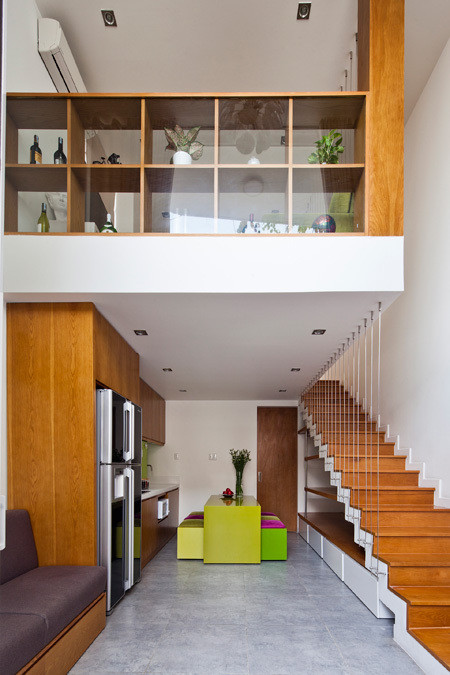 Ngôi nhà ở TP HCM có nhiều bất lợi như diện tích nhỏ (mặt tiền 4m), không vuông vắn. Ngoài ra, nhà nằm ở một khu dân cư đông đúc, lối đi lại nhỏ hẹp, khoảng cách giữa các nhà đối diện nhau rất gần.