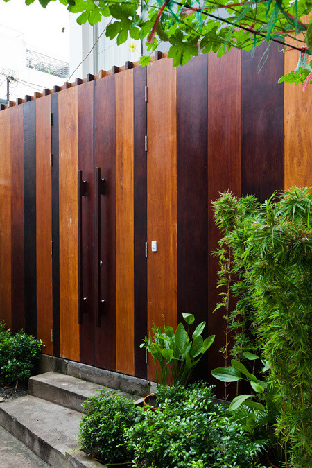 Cổng dẫn vào nhà kín đáo với những mảng gỗ ấm áp, thân quen. Màu xanh của những bình cây nhỏ đem lại chút thiên nhiên cho ngôi nhà trong ngõ nhỏ.