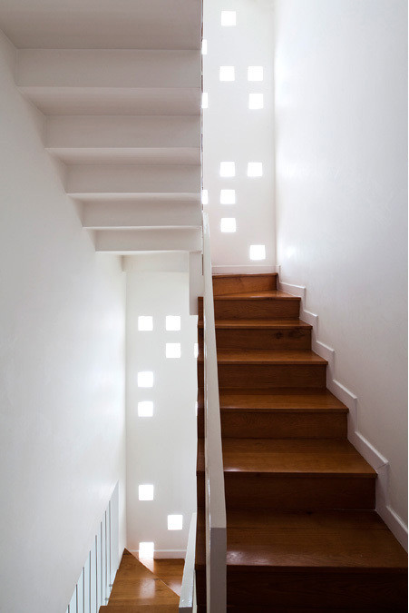 Những ô thoáng nhỏ lấy sáng cho khu vực cầu thang nằm ở phía sau cùng của nhà.