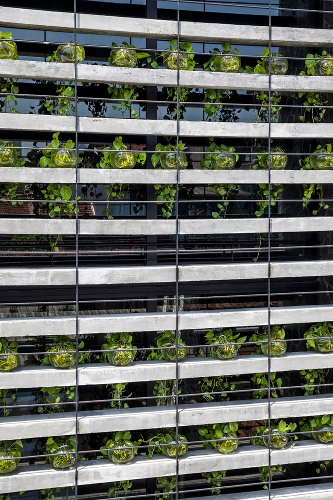 Để vừa lấy thoáng từ mặt tiền mà mái nhà vừa đảm bảo được sự an toàn và riêng tư, các khe thoáng và lam bê tông tuyến tính được sử dụng.