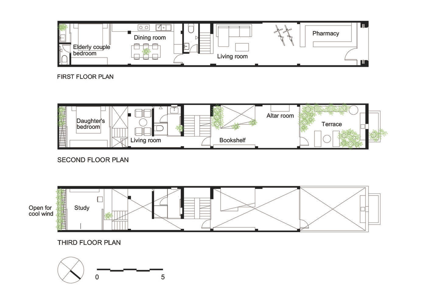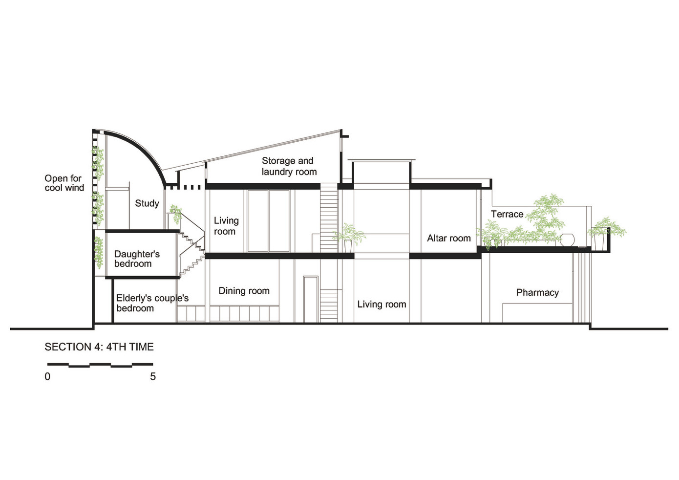 Để kết nối mối quan hệ giữa con người với nhau. Phòng ngủ của cặp vợ chồng lớn tuổi và phòng ngủ của con gái được sắp xếp gần nhau, khu bàn ăn được đặt trung tâm khối nhà ngay dưới giếng trời để mọi người dễ dàng quan sát và chăm sóc nhau.