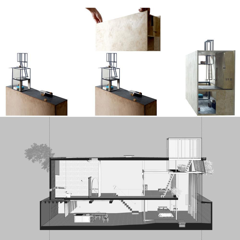 | Căn nhà được xây dựng trên diện tích đất quy hoạch là 4m x 17m nằm ở ngoại ô thành phố miền Nam Việt Nam. Gia chủ mong muốn công trình được xây dựng với chi phí thấp nhất có thể nên các kiến trúc sư đã để nguyên bề mặt bê tông bên ngoài, dùng kính lắp cửa rồi lấy gỗ để phân chia không gian bên trong (giường tầng) và gỗ thừa được tận dụng làm nội thất cho ngôi nhà.  | | Tầng 1 ngôi nhà chỉ cao 2m35 và dàn theo chiều ngang, tầng 2 cao 4m2 để giúp cho ngôi nhà tránh được hơi nóng vào mùa hè. |  | | Với điều kiện thời tiết của miền Nam Việt Nam không có mùa đông nên các kiến trúc sư phải bố trí các khe thông gió cố định trên bề mặt của ngôi nhà (mặt tiền, mặt sau, tầng thượng). Bởi về cơ bản, ngoài cửa chính (tầng 1) ngôi nhà này hầu như không có cửa sổ, nên việc thông gió từ trong ra ngoài nhà được thực hiện thông qua các khe cố định này. Điều này giúp giảm chi phí cho phần cửa cũng như giảm thời gian đóng cửa sổ cho những gia chủ độc thân.  | | Tuy nhiên, việc xử lý chống nóng cho ngôi nhà hướng Tây chính là một thách thức lớn. Do đó, bên ngoài nhà, nhóm thiết kế sử dụng bóng cây phía trên (cây cao phía trước, cây leo phía sau) làm mái hiên lớn. Bên trong, họ sử dụng không gian đệm, rèm vải, rèm tre có tác dụng điều chỉnh phần ánh sáng trực tiếp từ bên ngoài. |  | | Các kiến trúc sư chia công năng của ngôi nhà thành 2: Phần không gian động bao gồm bếp, phòng ăn, phòng khách; không gian tĩnh gồm 2 phòng ngủ, 1 dành cho chủ nhà, 1 dành cho khách. |  | | Đối với không gian tĩnh, nhóm thiết kế tận dụng vị trí chính Đông Tây của khu đất để làm phòng ngủ ở phía Đông, nơi có ánh sáng dịu vào buổi sáng (phía sau). |  | | Giường ngủ được kết cấu như một chiếc giường tầng với phần dưới dành cho chủ nhà, phần trên là cho khách.  |  | | Các không gian khác đặt ở phía Tây, nơi có ánh hoàng hôn vào buổi chiều. Trong đó bếp và bàn ăn là trung tâm (tầng 1). Các không gian này gần như thông thoáng tuyệt đối và nhìn ra được con đường yên tĩnh trước nhà để người độc thân như chủ nhà có thể nhìn thấy những hàng xóm xung quanh. |  | | Bản vẽ của ngôi nhà. | | | | |