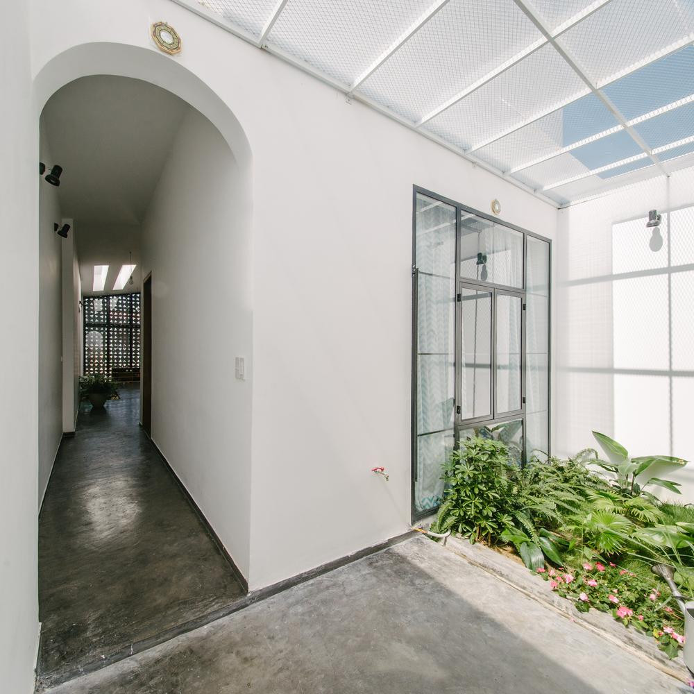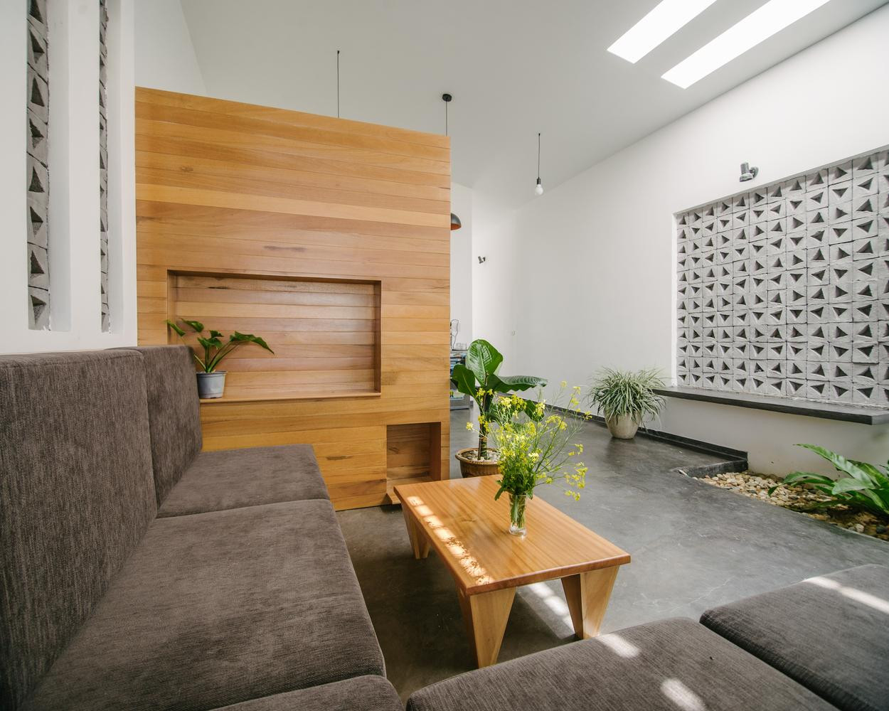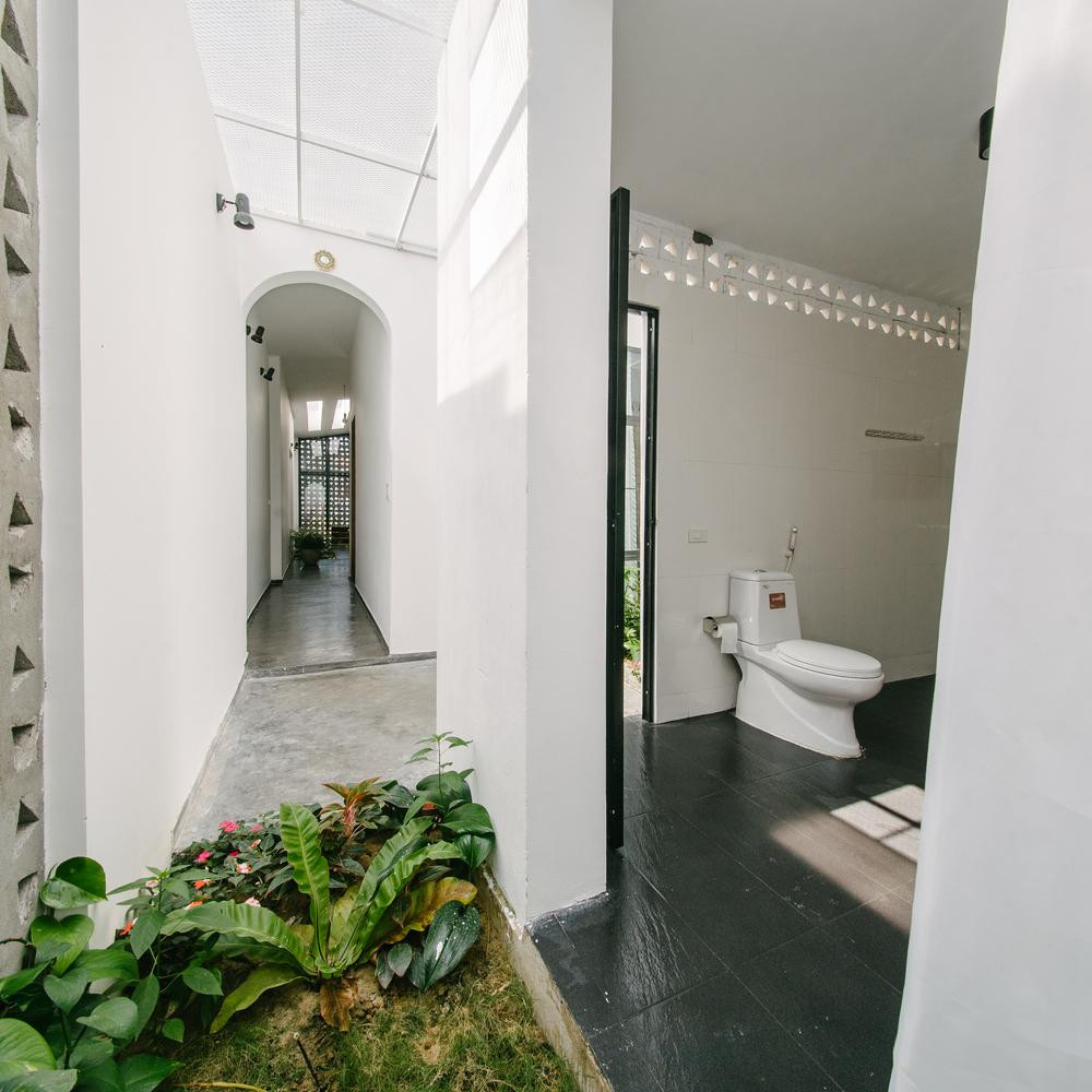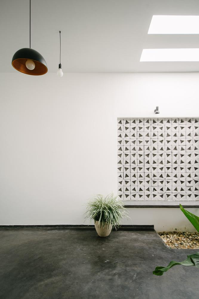 | Sống ở Kon Tum, nơi có khí hậu nhiệt đới với hai mùa đặc trưng là mùa khô và mùa mưa nên cặp vợ chồng trẻ với ngân sách eo hẹp mong muốn có ngôi nhà chống chọi được các điều kiện khí hậu khắc nghiệt.  | | Do đó, họ đã nhờ các kiến trúc sư thiết kế ngôi nhà ống một tầng mái lệch trên diện tích đất 5 x 23 mét.  | | Để khắc phục việc ngôi nhà quay về hướng Tây, đội thiết kế đã làm mặt tiền 2 lớp để giảm sức nóng của ánh nắng mặt trời gồm một bức tường bằng gạch hoa văn thông gió, phía trong có nhiều cửa kính nhỏ. |  | | Bức tường này còn có tác dụng trang trí nội thất cho ngôi nhà, nhờ việc ánh sáng xuyên qua các khối gạch hoa văn tạo nên không gian ánh sáng đa chiều ở phòng khách. Vách kính phía sau có thể đóng mở dễ dàng để điều chỉnh lượng gió vào nhà theo mùa. |  | | Các khối chức năng trải dài theo chiều dọc ngôi nhà. Từ cửa vào là phòng khách, ghế sofa tối màu được kê sát tường để lấy không gian đi lại, ngay dưới phòng khách là giếng trời chiếu xuống một khoảng đất nhỏ trồng cây xanh. |  | | Phòng khách được ngăn cách với bếp bằng một tấm gỗ trang trí. |  | | Sau bếp là không gian phòng ngủ của cặp vợ chồng trẻ và em bé mới sinh, phòng ngủ có cửa sổ kính lớn để nhìn ra khu vườn phía sau, liền kề với nhà vệ sinh. |  | | Khu vườn phía sau nằm dưới giếng trời lớn, là nơi cung cấp ánh sáng tự nhiên cho cả ngôi nhà cũng như được gia chủ tận dụng làm nơi phơi đồ mà không lo mưa, gió. |  | | Ngôi nhà sử dụng màu trắng làm chủ đạo, trong khi đồ nội thất và sàn bê tông có màu xám giúp tôn lên màu sắc của các vật liệu gỗ và màu xanh tươi của cây cỏ trong nhà. |  | | Nhờ hệ thống giếng trời, từ mọi nơi trong nhà đều có thể nhìn thấy ánh sáng tự nhiên và màu xanh của thiên nhiên. |  | | Tất cả mọi thứ trong ngôi nhà đều hết sức đơn giản và nhẹ nhàng, nhưng khi kết hợp lại đã tạo ra không gian lí tưởng cho một gia đình trẻ. | | |