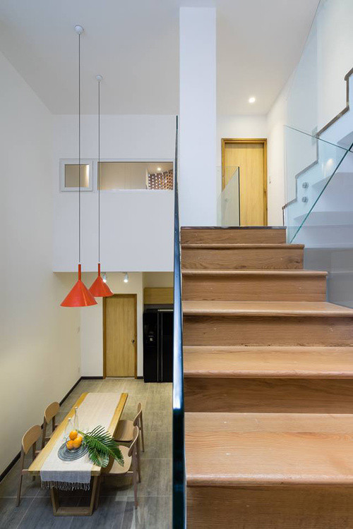 Phần thông tầng giúp phòng ăn trở nên cao, thoáng hơn. Kiến trúc sư cũng tối giản mọi yếu tố trang trí, để nhà đẹp nhờ chính các chi tiết vật liệu.