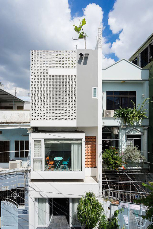 Sau khi hoàn thiện, ngôi nhà ống 4 tầng ở quận Phú Nhuận (TP HCM) nổi bật giữa con hẻm gồm những công trình xây kiểu cũ. Mặt tiền phối hợp hài hòa giữa gạch lỗ, ô cửa kính khiến nhà trông giống như một khối hộp đồ chơi xinh xắn.