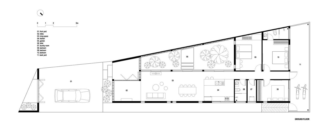 | Cụ thể, ngôi nhà được chia làm 3 phần, trong đó phần đầu phía mặt tiền là sảnh đón khách vào nhà; phần thứ hai là không gian sinh hoạt chung gồm phòng khách, nhà bếp, phần này được chia làm 2 theo chiều dọc, một nửa là công trình một nửa là khu vườn; phần thứ ba đón tiếp cả phần chức năng và khu vườn là khu vực 2 phòng ngủ, nhà vệ sinh. |