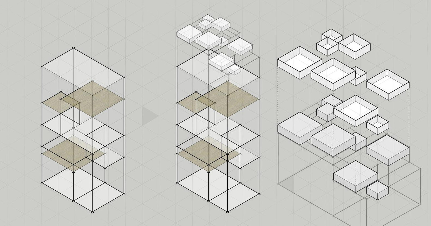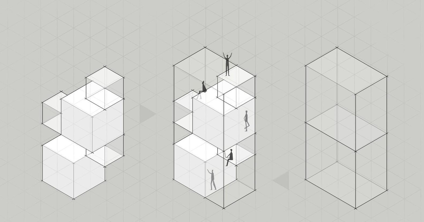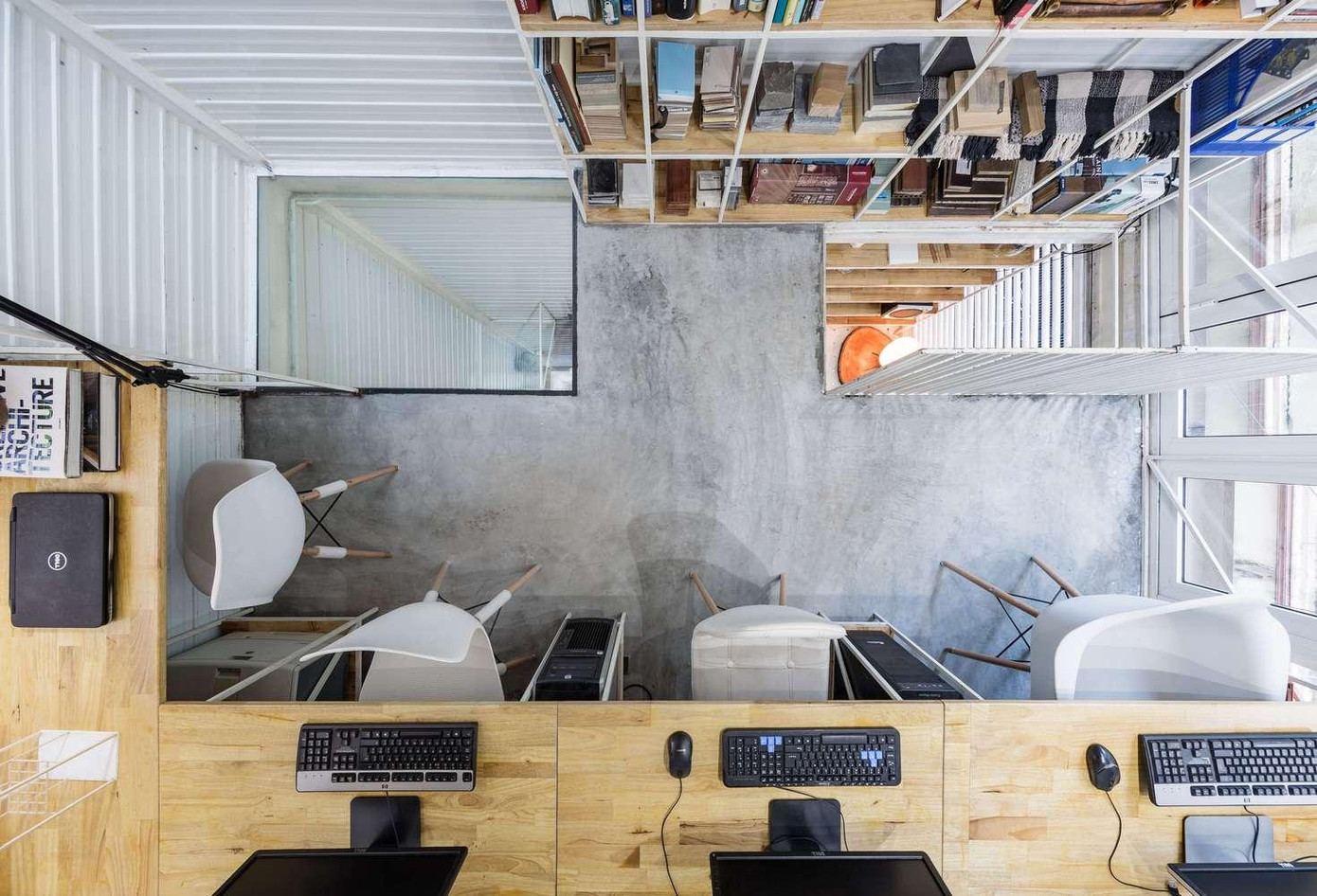 | Tầng 1 bao gồm phòng khách và nhà vệ sinh. Tầng 2 và các gác lửng xen kẽ được bố trí thành phòng làm việc và một gian bếp nhỏ. |