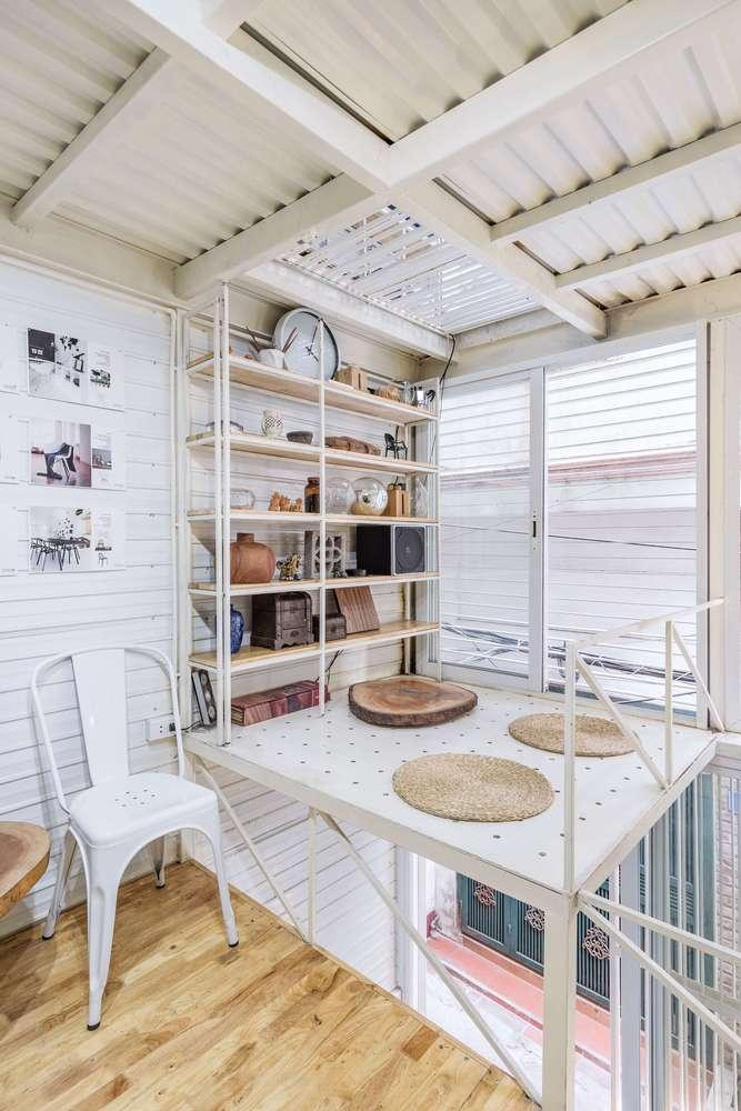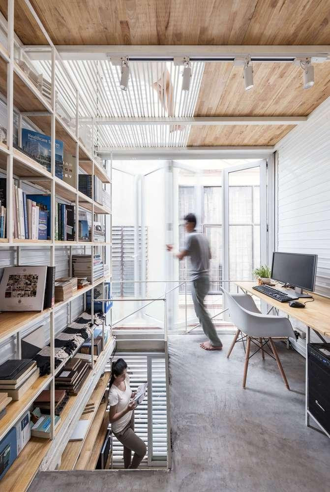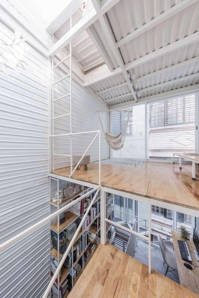 | Các tầng lửng được làm bằng gỗ cao su đàn hồi, kết hợp với các tấm kim loại trắng và sàn bê tông xám, tạo ra một không gian đơn giản mà hiện đại. |