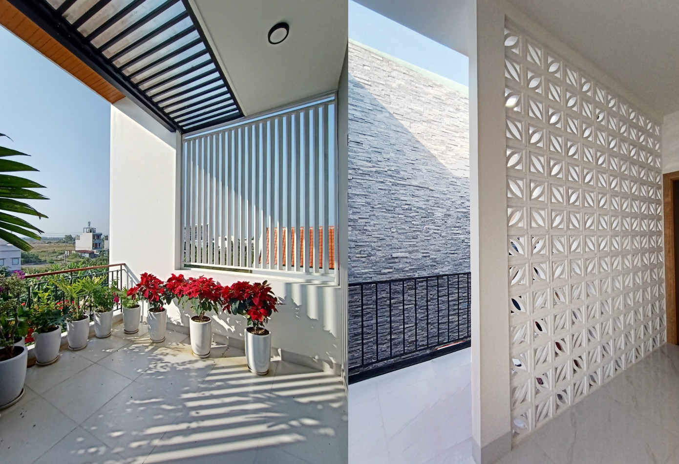 Kết hợp với hệ mái sắc cách điệu lợp kính trong, vừa che mưa, vừa không làm tối ngôi nhà.