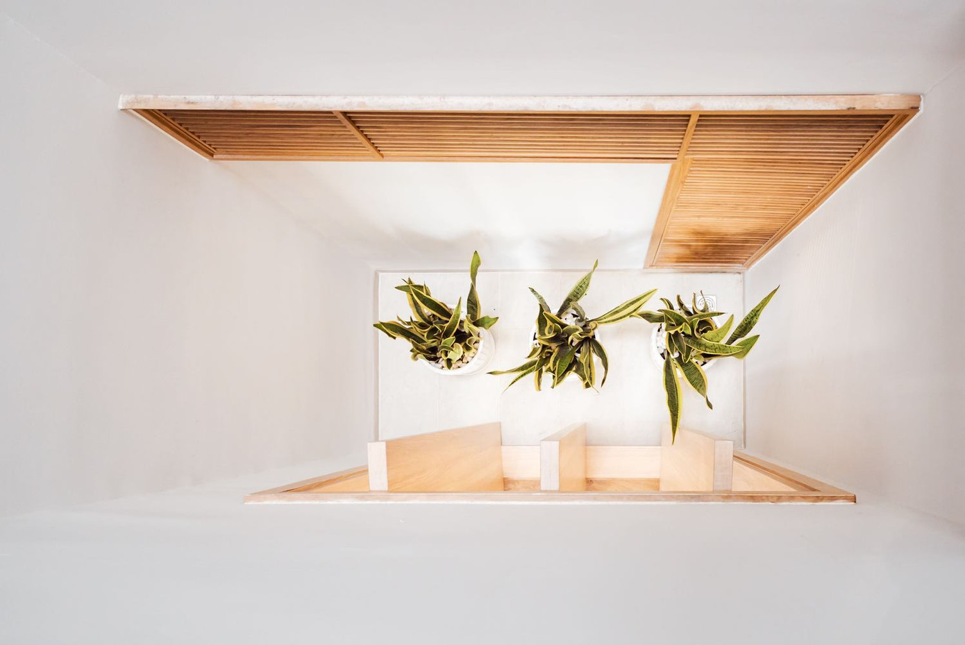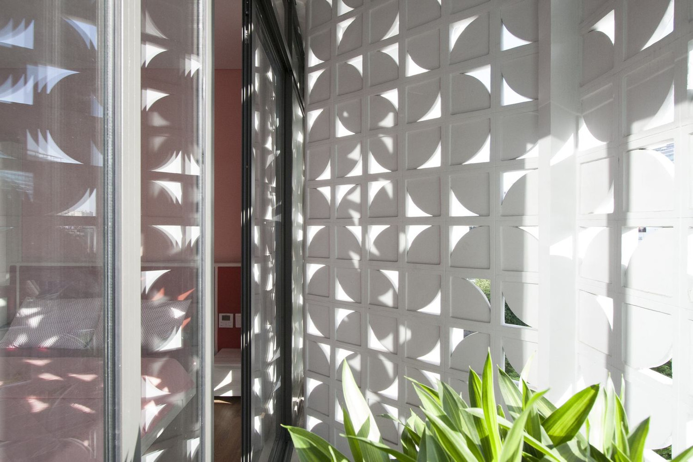 Những bức tường hoa gió được đặt đan xen nhau để giúp không gian nhà tận dụng được ánh sáng, nhưng vẫn đảm bảo được sự lưu thông khí tự nhiên.